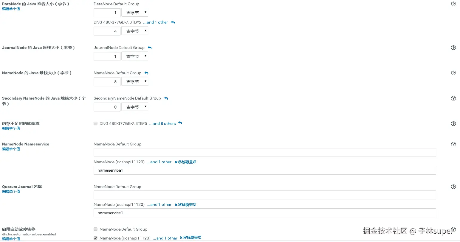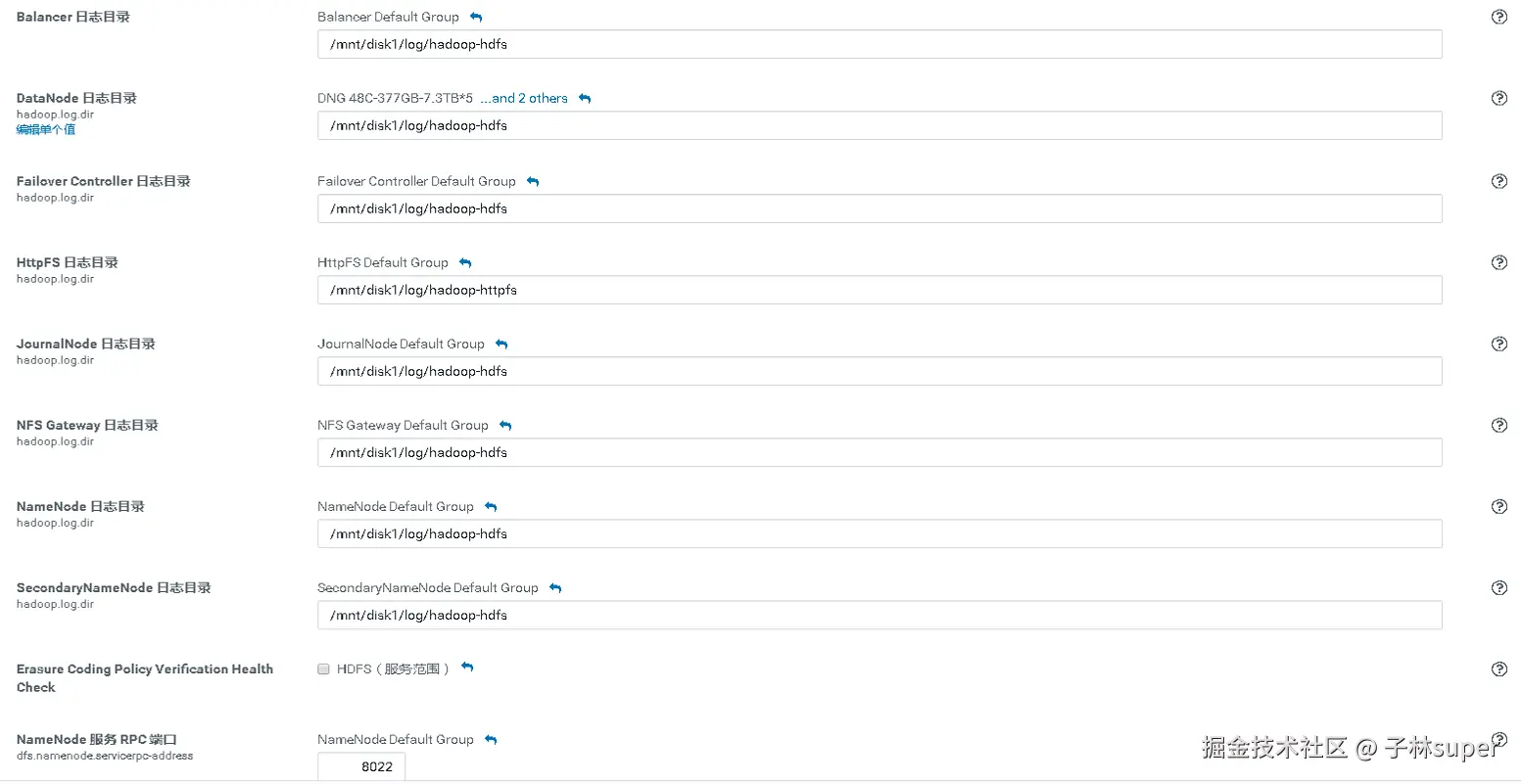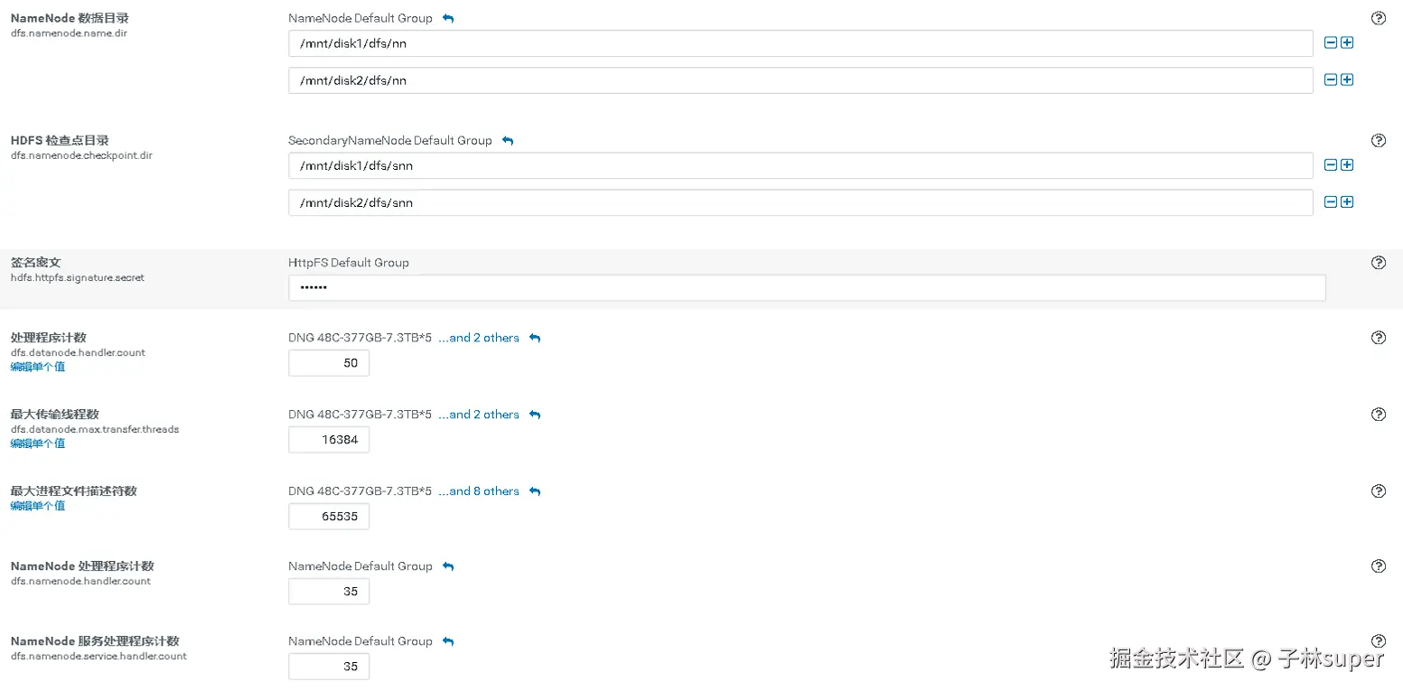 NameNode 数据目录:/mnt/[disk1-disk2]/dfs/dn SecondaryNode 数据目录:/mnt/[disk1-disk2]/dfs/snn Balancer 日志目录:/mnt/disk1/log/hadoop-hdfs Failover Controller 日志目录:/mnt/disk1/log/hadoop-hdfs HttpFS 日志目录:/mnt/disk1/log/hadoop-httpfs JournalNode 日志目录:/mnt/disk1/log/hadoop-hdfs NFS Gateway 日志目录:/mnt/disk1/log/hadoop-hdfs NameNode 日志目录:/mnt/disk1/log/hadoop-hdfs SecondaryNameNode 日志目录:/mnt/disk1/log/hadoop-hdfs DataNode 的 Java 堆栈大小:4GB JournalNode 的 Java 堆栈大小:1GB NameNode 的 Java 堆栈大小:8GB Secondary NameNode 的 Java 堆栈大小:8GB 内存不足时的转储堆:关闭 dfs.datanode.handler.count: 50 dfs.datanode.max.transfer.threads: 16384 最大进程文件描述符数:65535 dfs.namenode.handler.count: 35 dfs.namenode.service.handler.count: 35