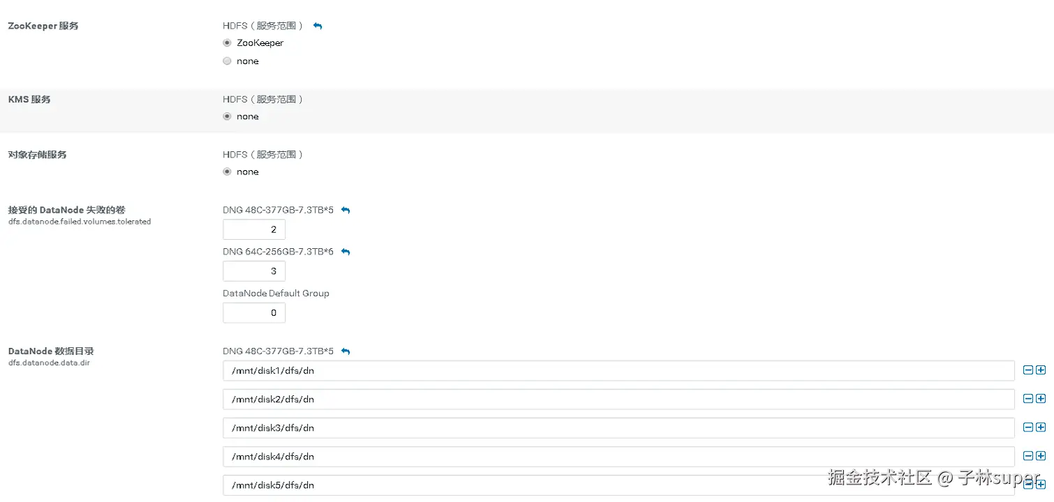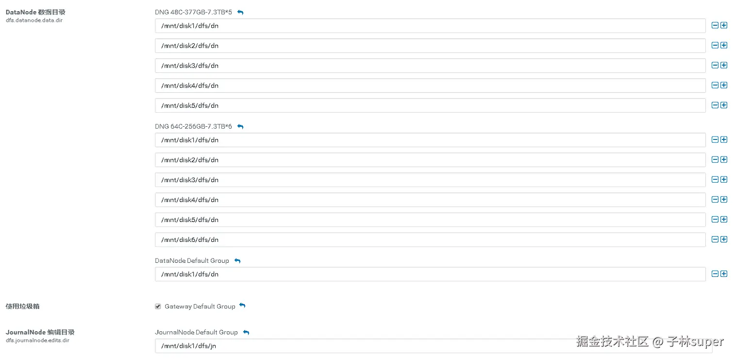 DataNode 数据目录:/mnt/[disk1-disk6]/dfs/dn