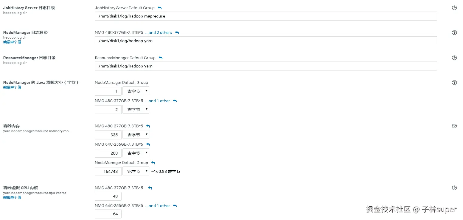 NodeManager本地目录:/mnt/[disk1-disk5]/yarn/nn NodeManager容器日志目录:/mnt/[disk1-disk5]/yarn/container-logs 容器内存:335GB 容器虚拟CPU内核:48