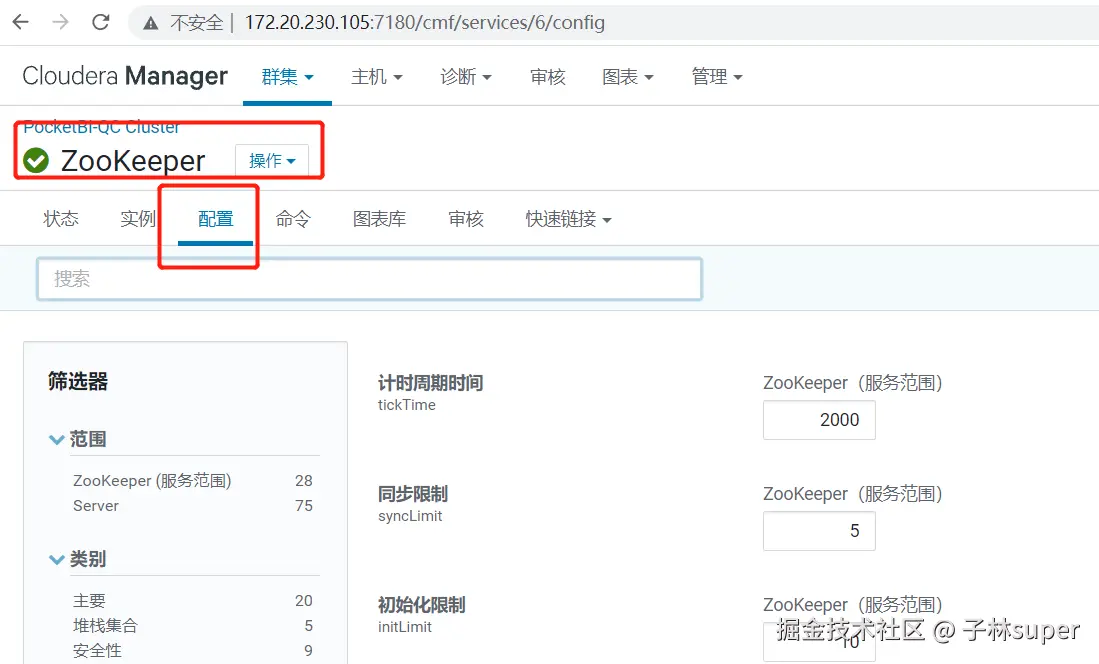 数据目录:/mnt/disk1/lib/zookeeper 事务日志:/mnt/disk1/lib/zookeeper ZooKeeper日志目录:/mnt/disk1/log/zookeeper 最大客户端连接数:300 ZooKeeper Server 的 Java 堆栈大小:2GB 内存不足时的转储堆:关闭