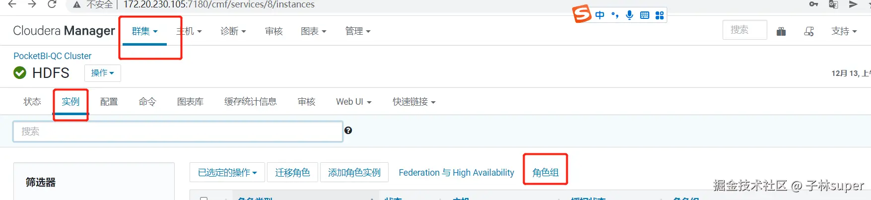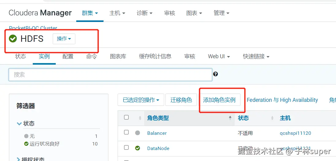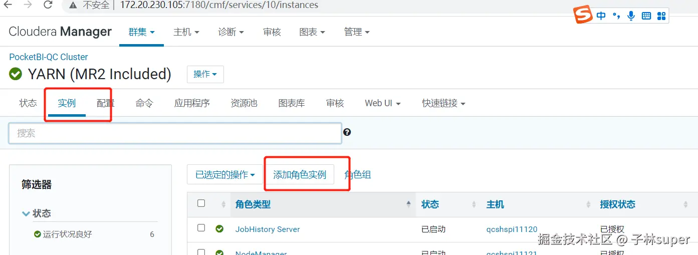 | qcshspi11120 | 172.20.230.106 | 64C-256GB-50GB+7.3TB*6 | centeros7.6 | CM-Agent\MySQL主\Balancer\NameNode\JournalNode\DataNode\ResourceManager\NodeManager\ZooKeeper-Server |