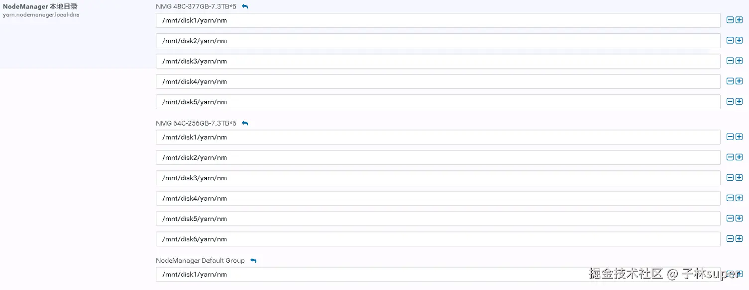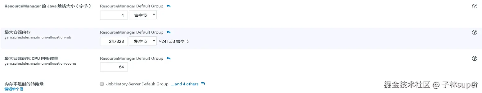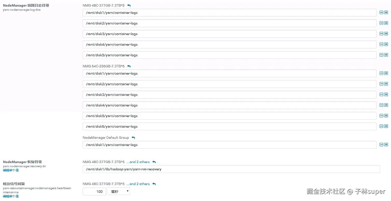 NodeManager本地目录:/mnt/[disk1-disk6]/yarn/nn NodeManager容器日志目录:/mnt/[disk1-disk6]/yarn/container-logs 容器内存:200GB 容器虚拟CPU内核:64