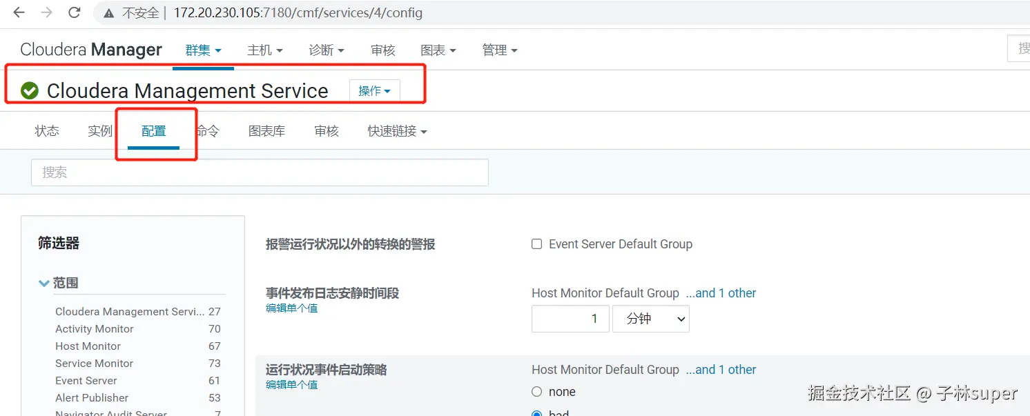 Event Server 索引目录:/mnt/disk1/cloudera-scm-eventserver Host Monitor 存储目录:/mnt/disk1/cloudera-host-Monitor Service Monitor 存储目录:/mnt/disk1/cloudera-service-Monitor Activity Monitor 日志目录:/mnt/disk1/cloudera-scm-firehose Alert Publisher 日志目录:/mnt/disk1/cloudera-scm-alertpublisher Event Server 日志目录:/mnt/disk1/cloudera-scm-eventserver Host Monitor 日志目录:/mnt/disk1/cloudera-scm-firehose Server Monitor 日志目录:/mnt/disk1/cloudera-scm-firehose Service Monitor 的最大非JAVA内存:6GB 内存不足时的转储堆:关闭