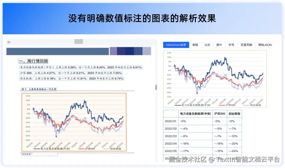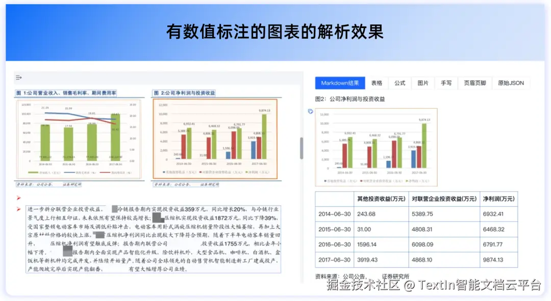 同时,TextIn文档解析近期上线的“图表解析”功能,更是进一步解决了金融研报、市场分析材料、学术论文等类型文档中,柱状图、折线图、散点图等各类图表承载大量信息,但却难以被大模型读懂的难点。