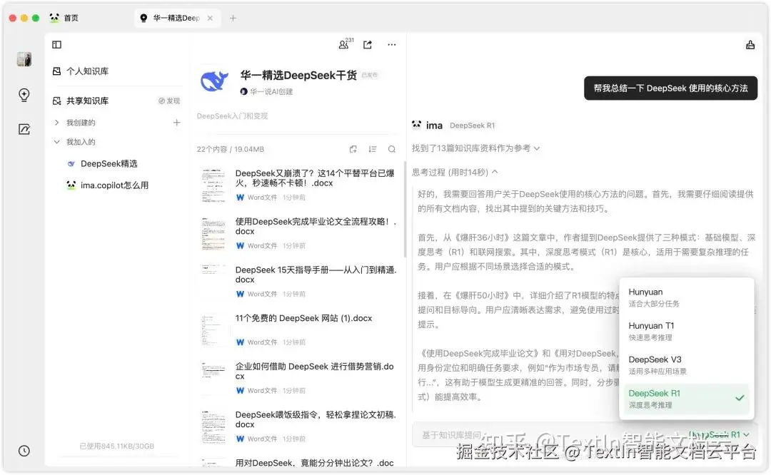 我也会直接把这些解析过的文件批量上传到 ima 知识库,然后用它的 DeepSeek 模型跟这个知识库对话,好用到飞起。