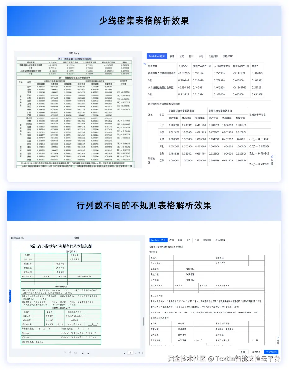 TextIn文档解析很好地解决了这些技术难点,尤其在复杂表格识别方面,无论是有线表、无线表、有线无线混合表、密集表格、带底色表格,还是合并单元格、跨页表格,都能精准解析。