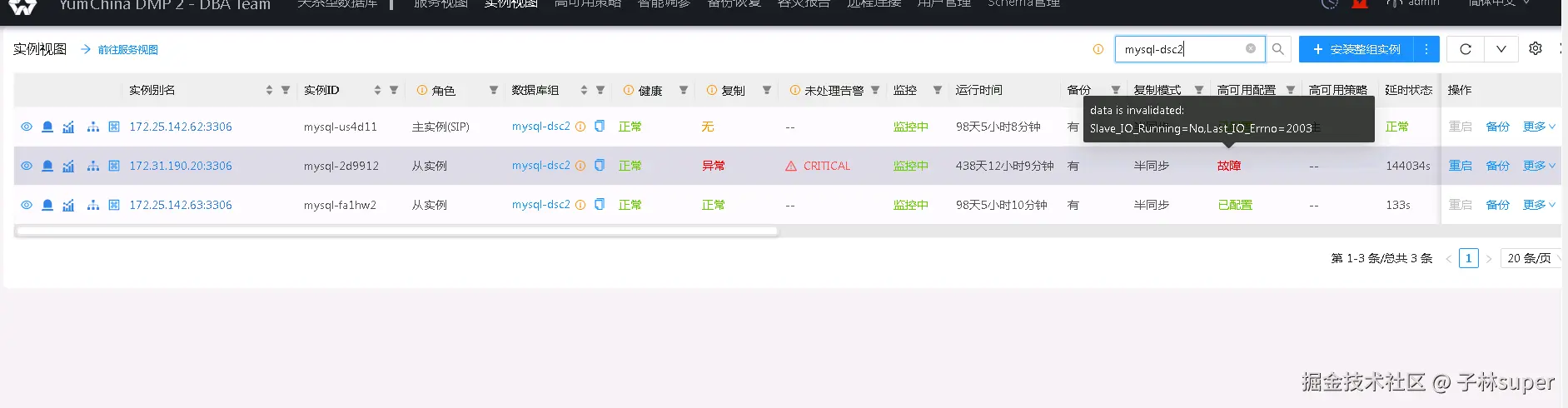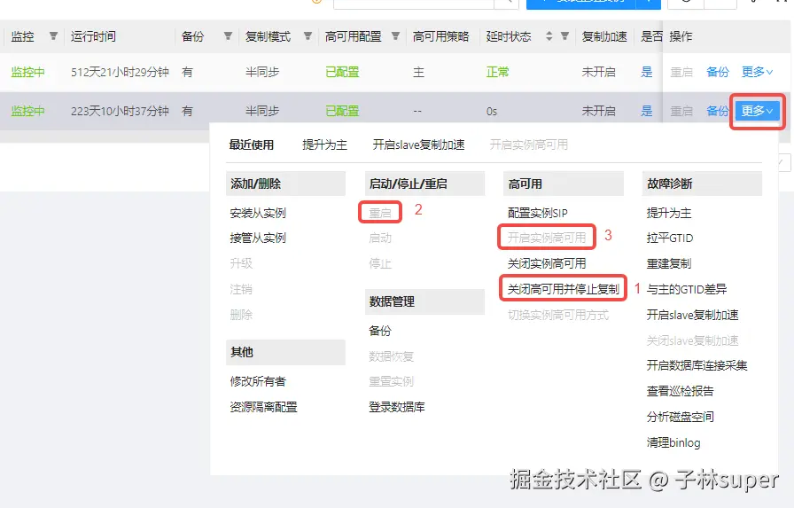 关闭高可用并停止复制,重启数据库,开启实例高可用