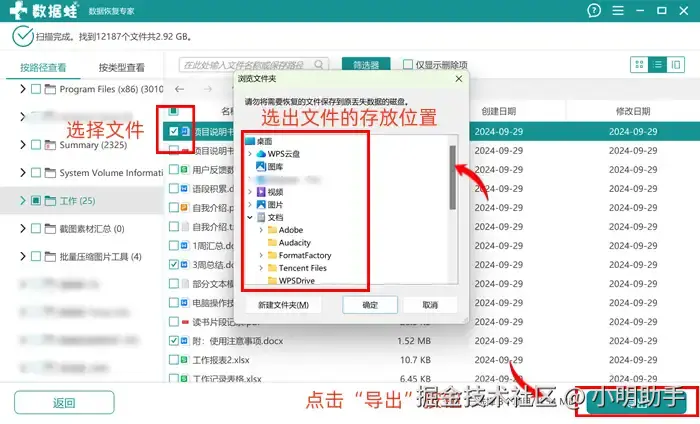 第2步: 在数据 蛙扫描出来的文件中,我们可以根据文件的类型、名字、大小、修改时间等信息尝试定位目标文件;选中文件后;按下“导出”,然后再选择好文件存放在电脑的位置。