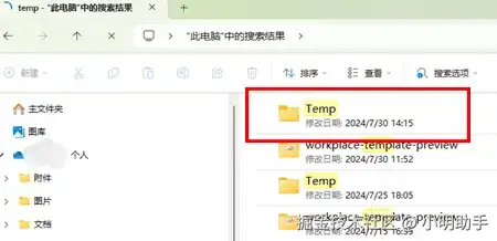 通过“此电脑”里面的“临时文件夹”也有机会找回被覆盖的Word文档版本。word不小心关闭没保存怎么恢复?Word没保存怎么恢复?在“此电脑”的搜索框中输入“temp”,找到同名文夹夹。