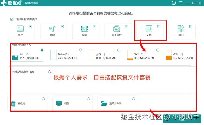 以数据 蛙恢复专家为例子,这款软件不仅支持直接选择“文档”作为扫描类型,有其他数据类型恢复需求的话,我们还可以选择图片、视频、音频、电子邮件。