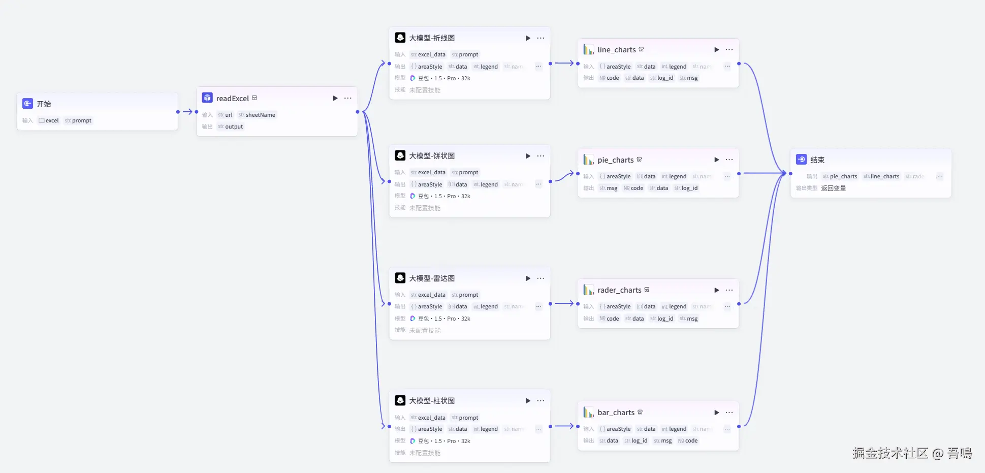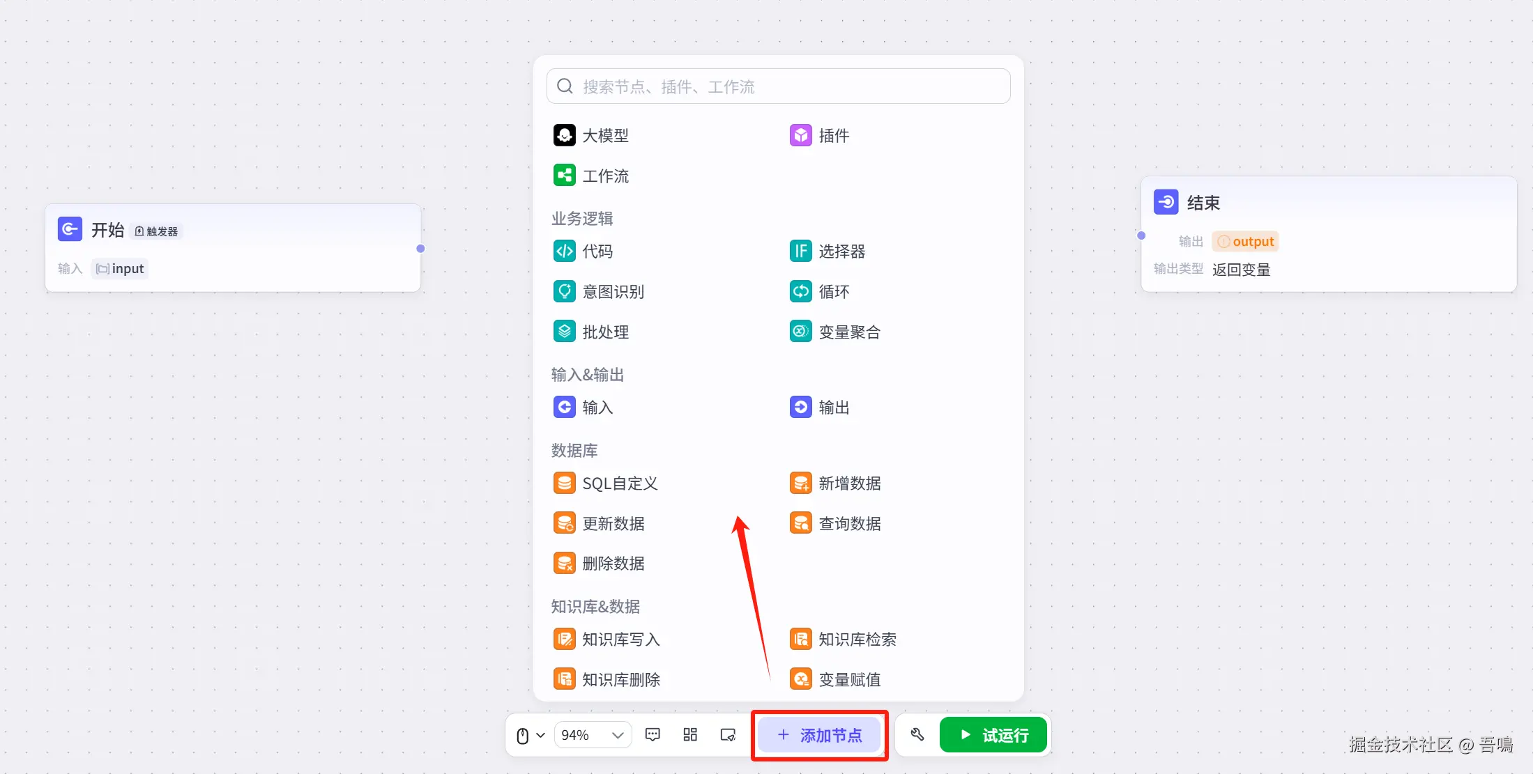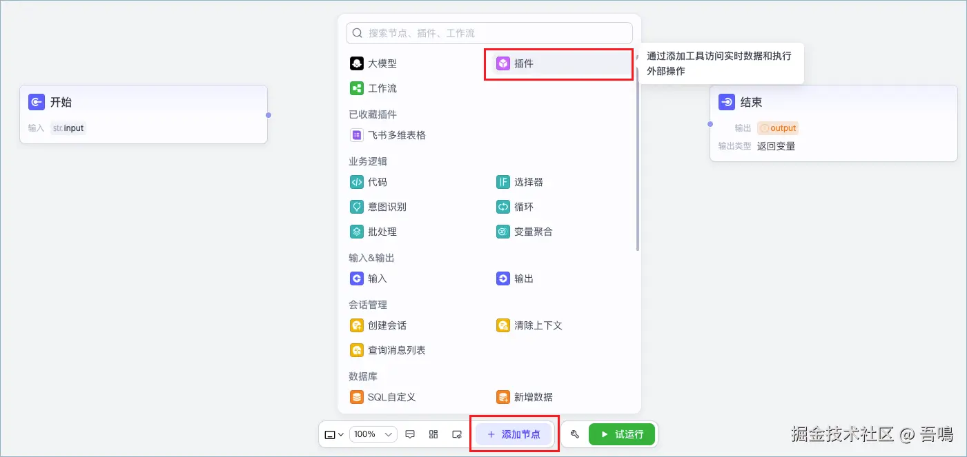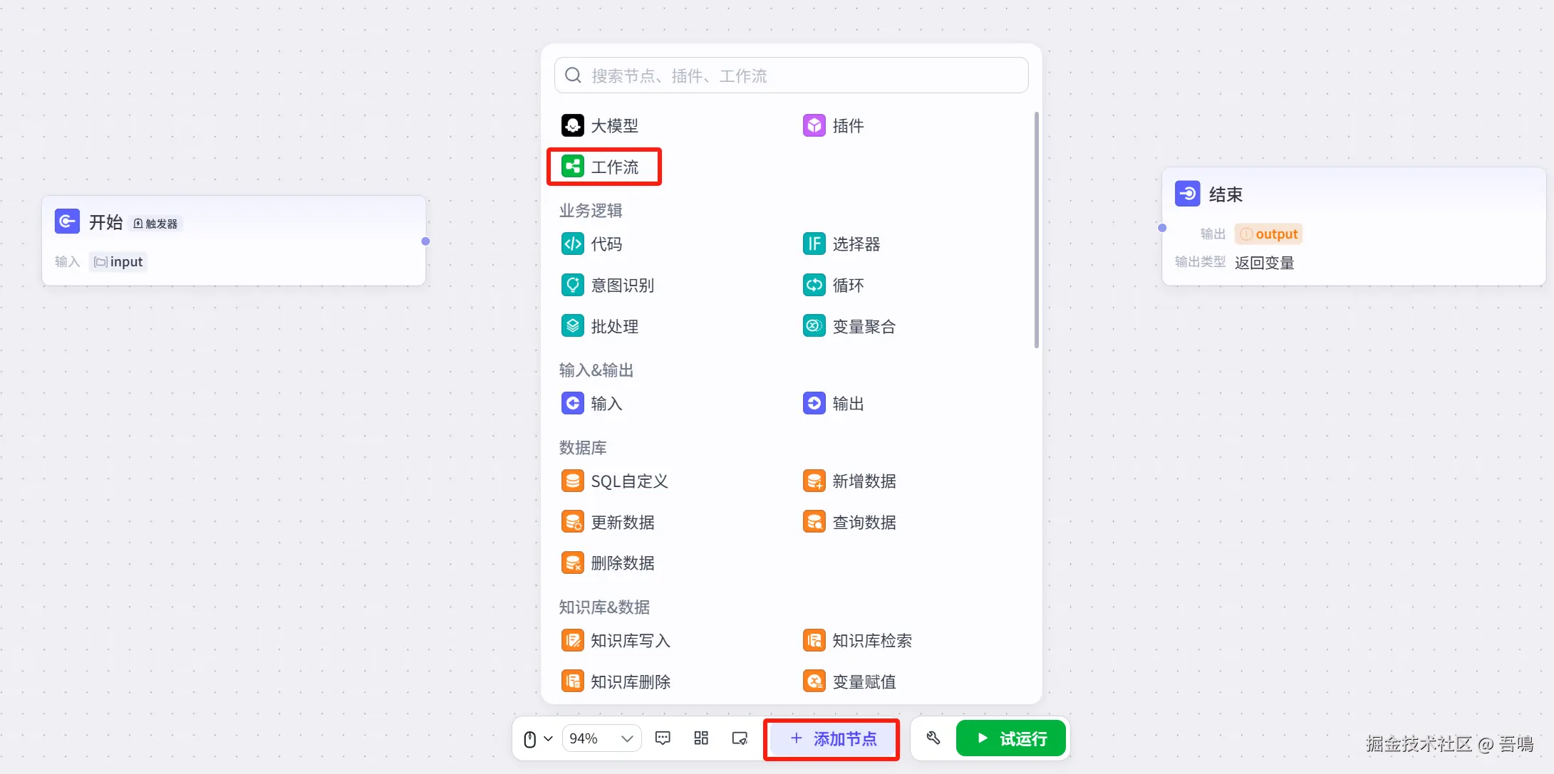 - 结束节点:结束节点是整个工作流的最后一个节点,输出整个工作流的处理结果。