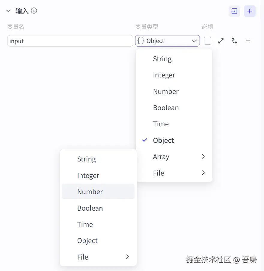 扣子里面的每一种类型的节点输入和输出变量都有一些类型,需要与引用的节点的变量类型匹配。