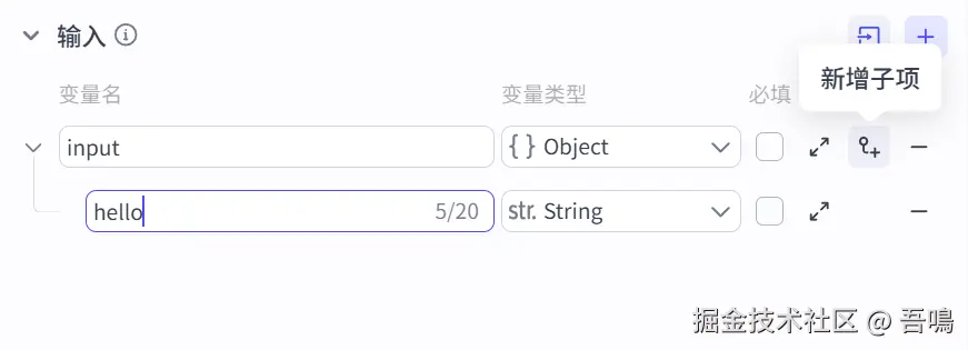 - 输入:接收的输入参数,可以选择其上游的节点的输出的内容