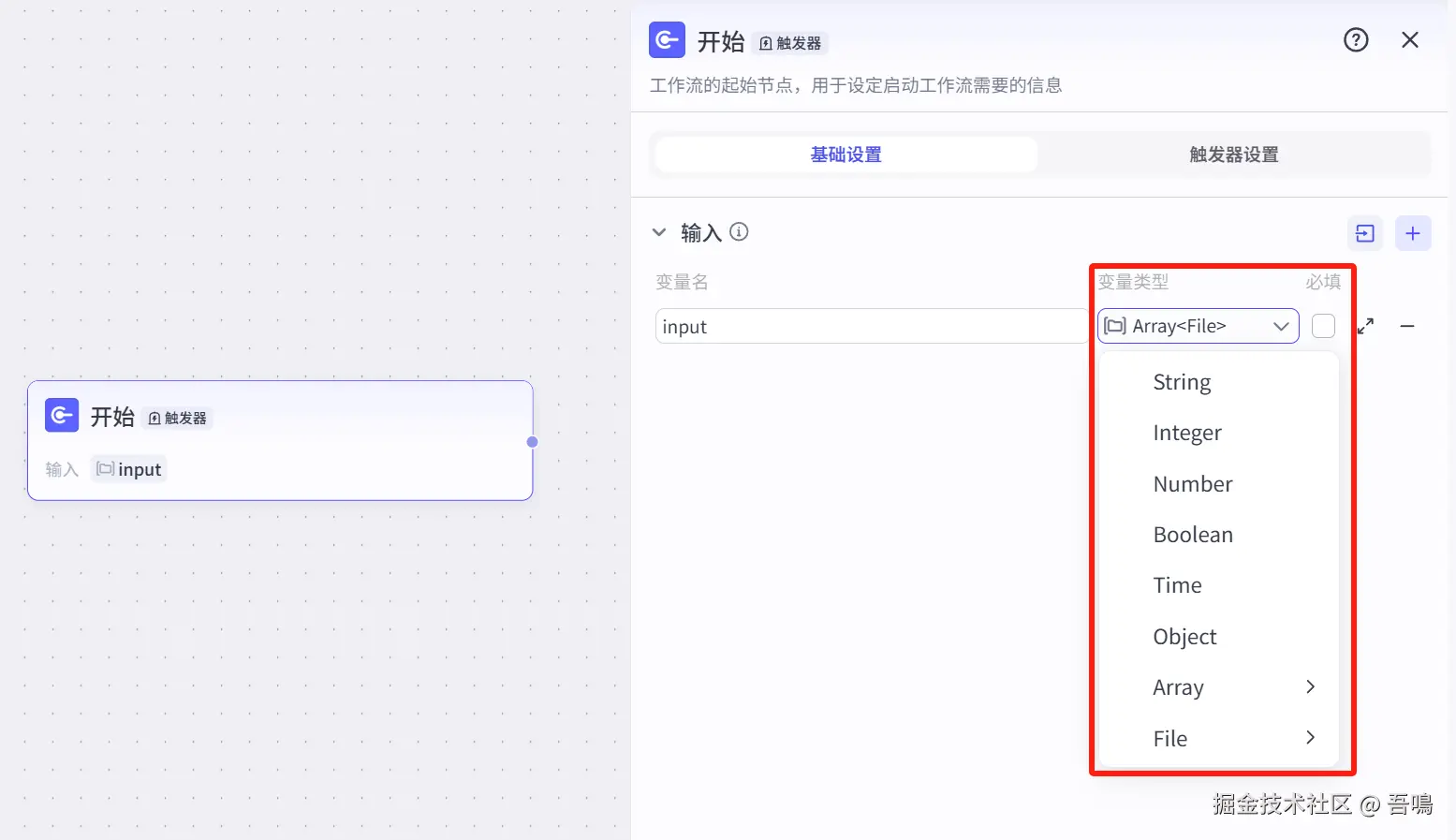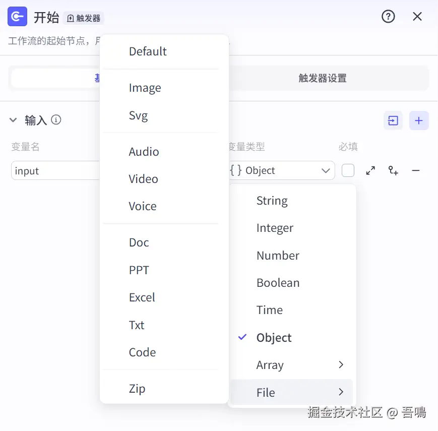 - 开始节点:开始节点是整个工作流的第一个节点,用于接收整个工作流的输入参数。