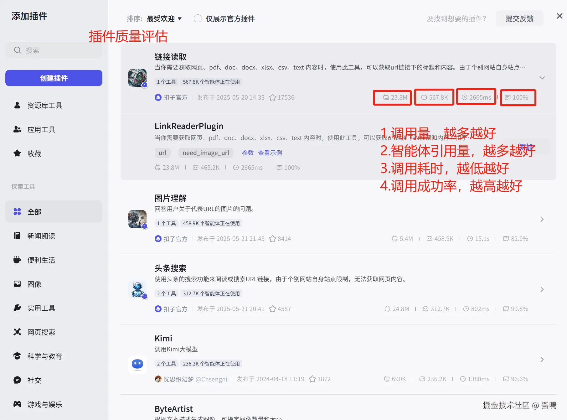 - 插件节点:工作流中运行的特定的工具,这里面有非常多现成的工具,基本能满足你所有需求,用得最多的节点。关于插件质量如何评估?看有多少个智能体在使用、平均耗时、调用的次数、调用成功率。