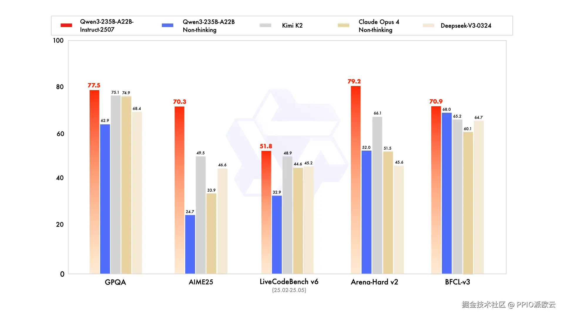 Qwen3-235B-A22B-Instruct-2507 模型的通用能力显著提升,包括指令遵循、逻辑推理、文本理解、数学、科学、编程及工具使用等方面,在GQPA(知识)、AIME25(数学)、LiveCodeBench(编程)、Arena-Hard(人类偏好对齐)、BFCL(Agent能力)等众多测评中表现出色,官方称超过 Kimi-K2、DeepSeek-V3 等顶级开源模型以及 Claude-Opus4-Non-thinking 等领先闭源模型。