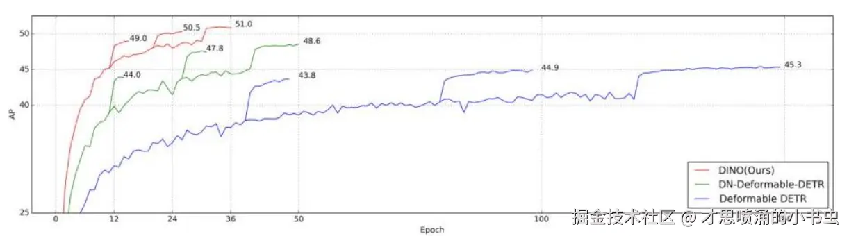 图7:DINO、DN-Deformable-DETR 和 Deformable DETR 之间的训练收敛比较,显示 DINO 更快的收敛和更高的性能。