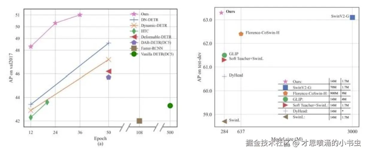 图1:DINO 模型与其他 DETR 变体的性能比较。(a) DINO 模型在 COCO val2017 上以更少的训练周期实现显著更高的 AP。(b) DINO 在各种模型尺寸上优于(当时)最先进的模型。