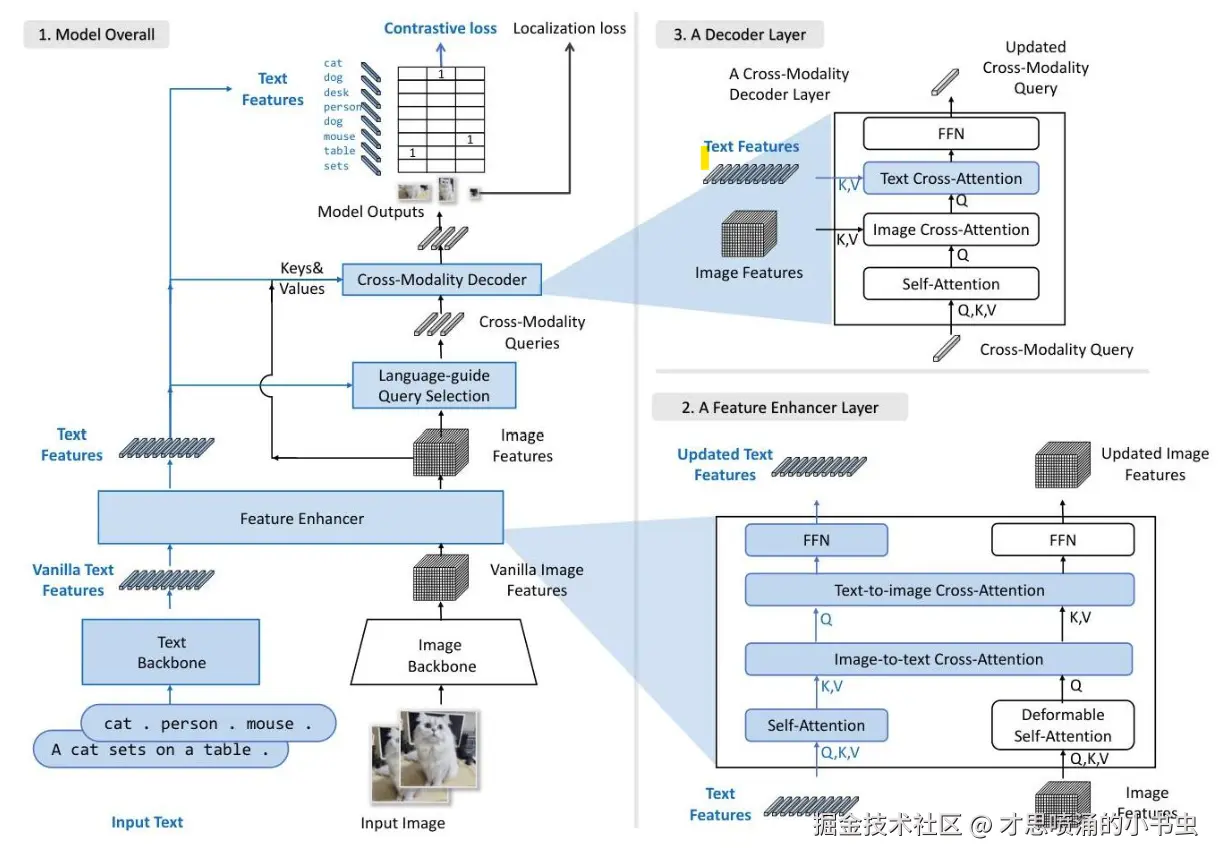 (3)特征增强器:使用交叉注意力机制增强和融合来自两种模态的特征。想象它像一个翻译员,帮助视觉系统和语言系统相互理解和增强彼此的信息。