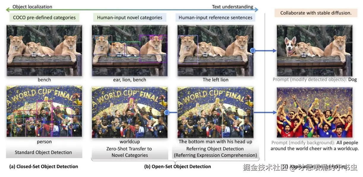 图1:从闭集到开集目标检测的演进及其在图像编辑中的应用。左图是具有预定义类别的传统目标检测,中间是带有人类语言输入的开集检测,右图是与 Stable Diffusion 集成用于图像编辑的效果展示。