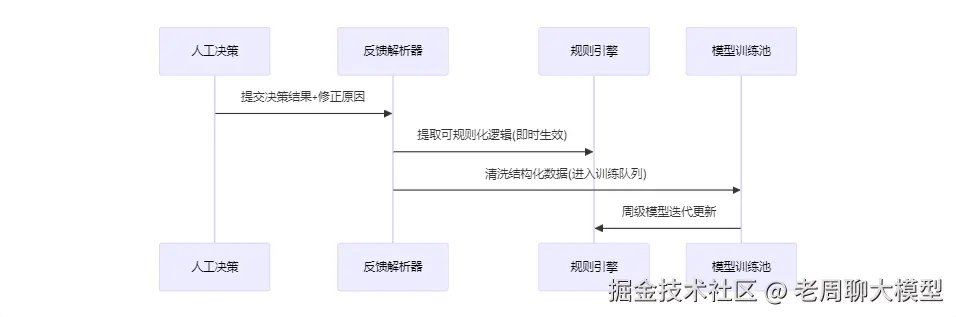 - 短期反馈环:实时规则注入(人工决策→规则引擎)