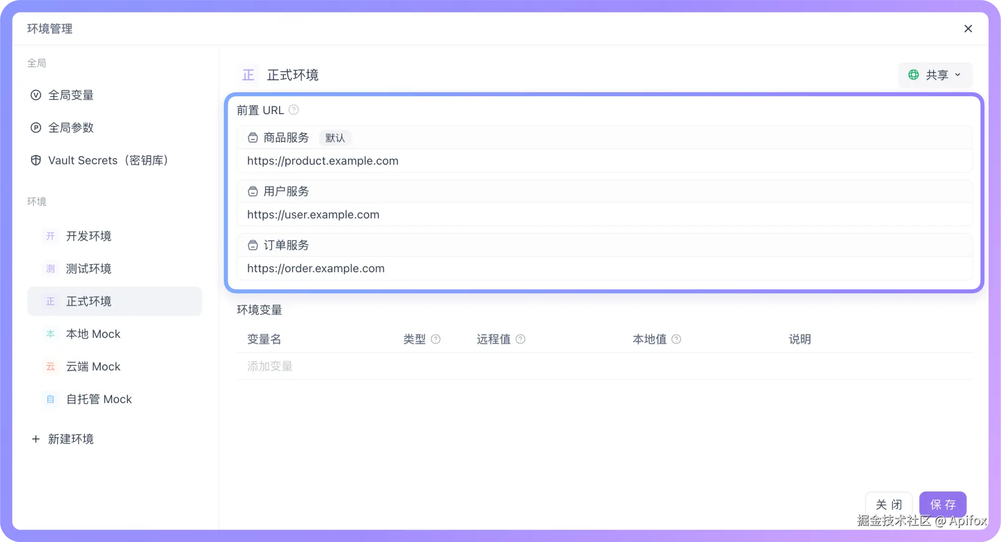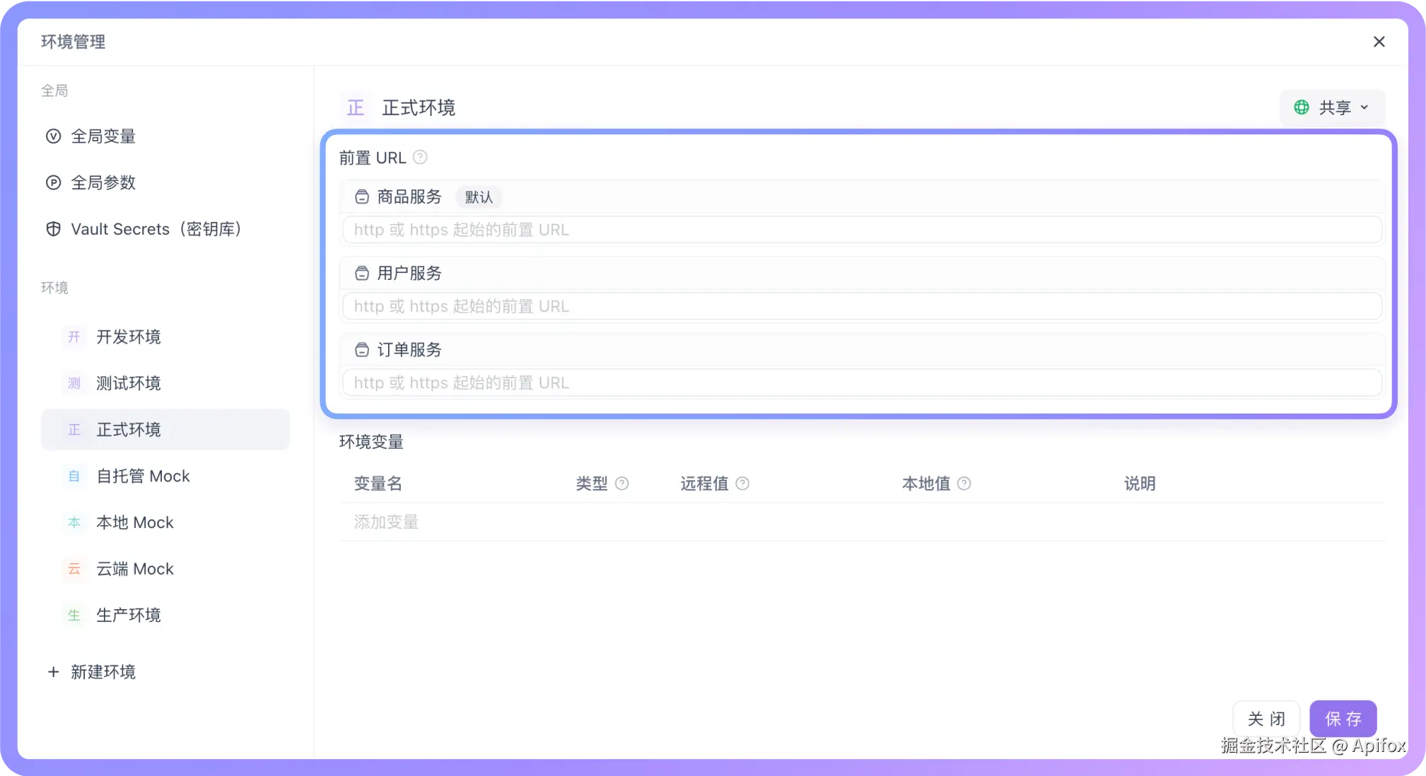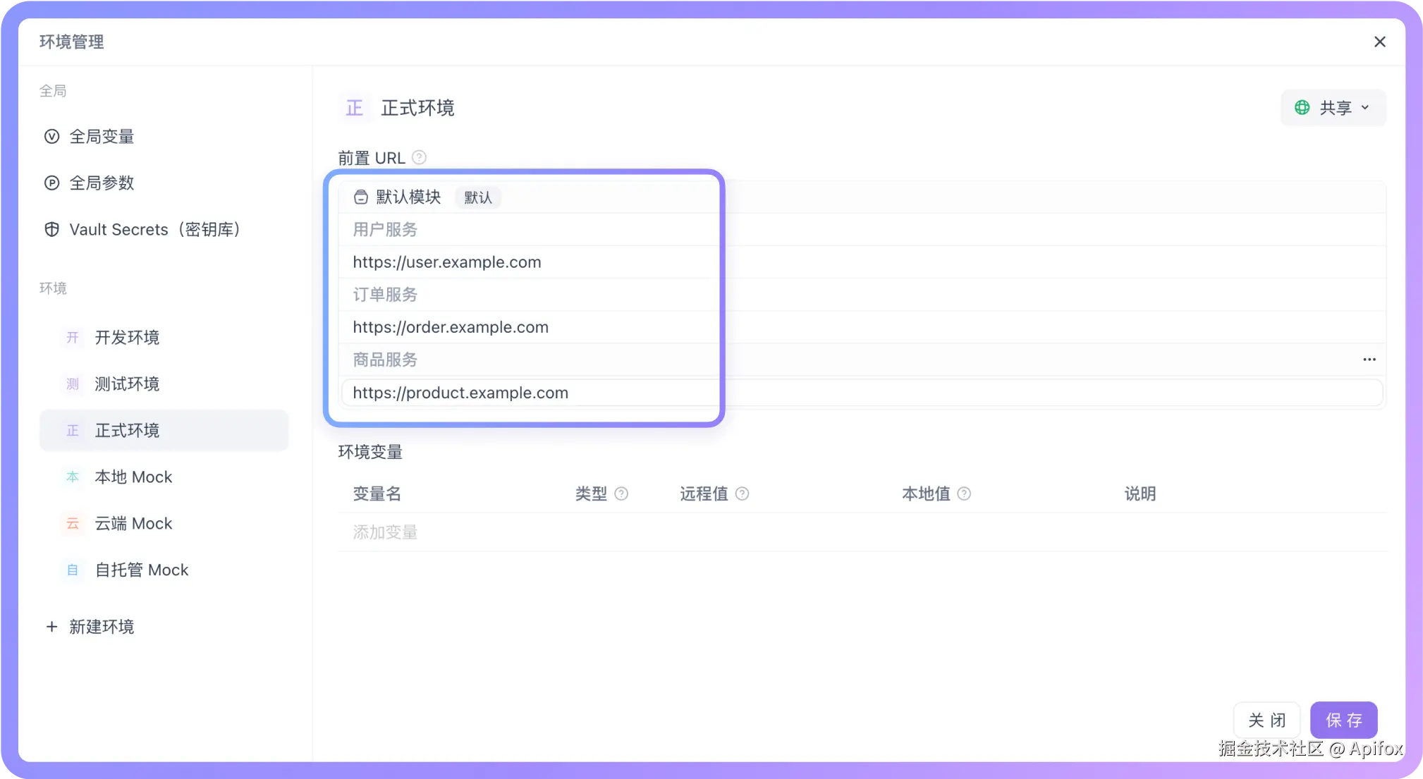 你可以将每个服务拆分为单独的模块,并在“环境管理”中为每个模块配置在不同环境下的前置 URL。这种方式更结构化,也更适合多人协作和长期维护。