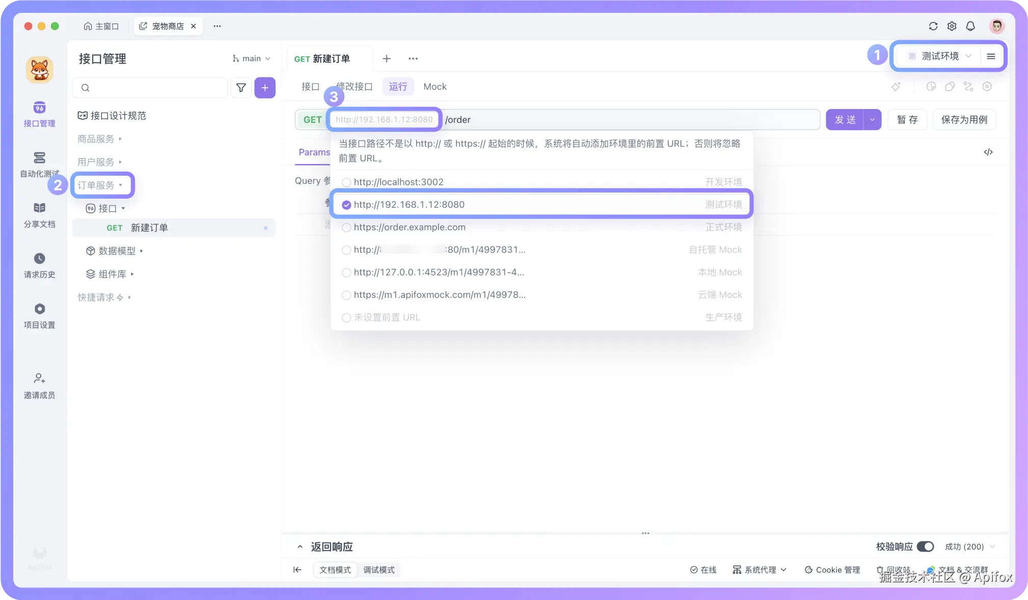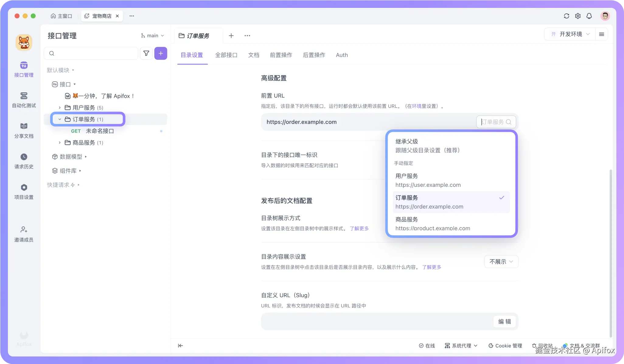 配置完成后,你可以在用户相关的目录设置里选择使用“用户服务”的地址,在订单目录里选择“订单服务”的地址。这样该目录下的所有接口都会使用对应的前置 URL。