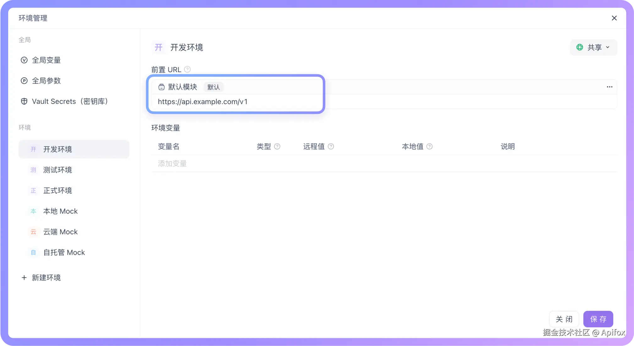 选择一个环境后,你会看到「前置 URL」的输入框。这里填入以协议 (http:// 或 https://) 起始的基础地址,比如https://test.server.com,或者加个版本号,比如https://api.example.com/v1。