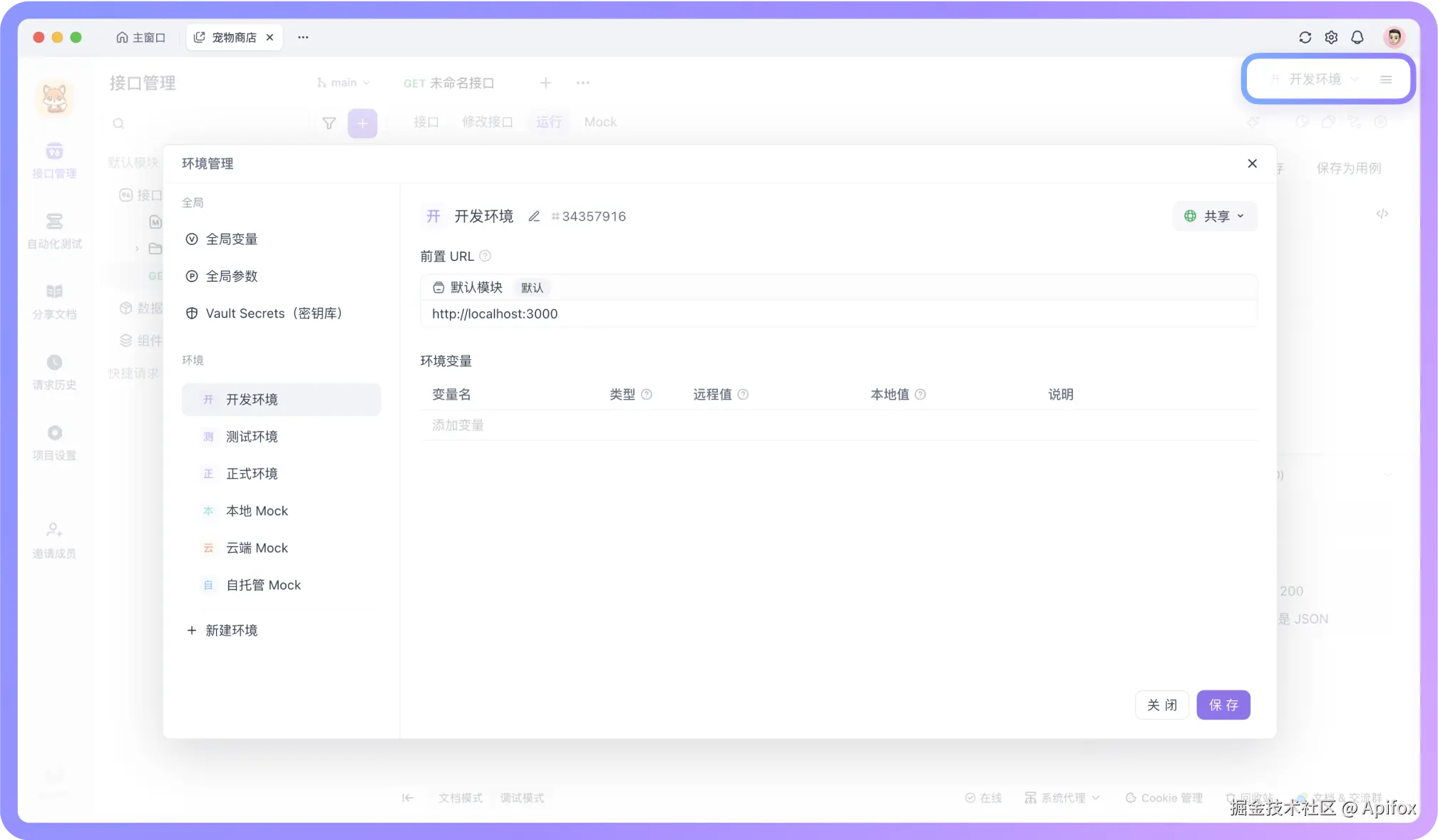 打开 Apifox 项目,在页面右上角找到「环境管理」。Apifox 会默认为项目创建几个常用环境,比如开发环境、测试环境、正式环境,你可以直接使用这些预设环境,也可以根据需要新建其他环境。