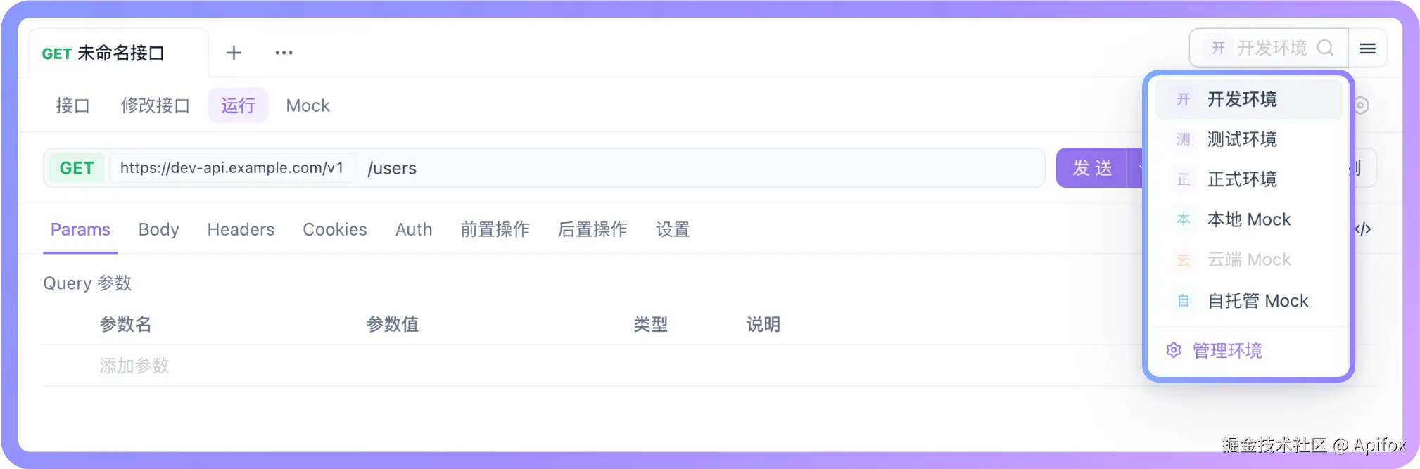 除了在右上角切换,你也可以直接在接口地址栏中选择环境,这里会显示各环境的默认前置 URL,与「环境管理」中的切换行为是等效的。