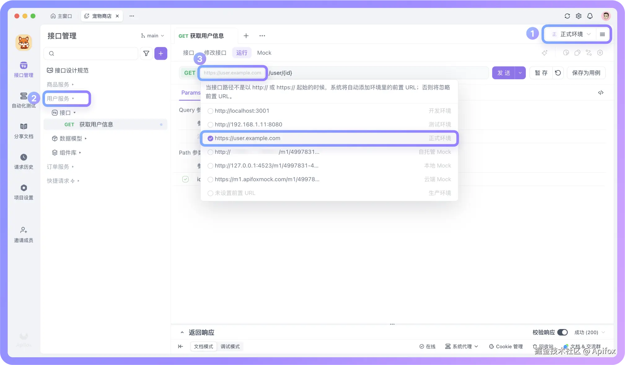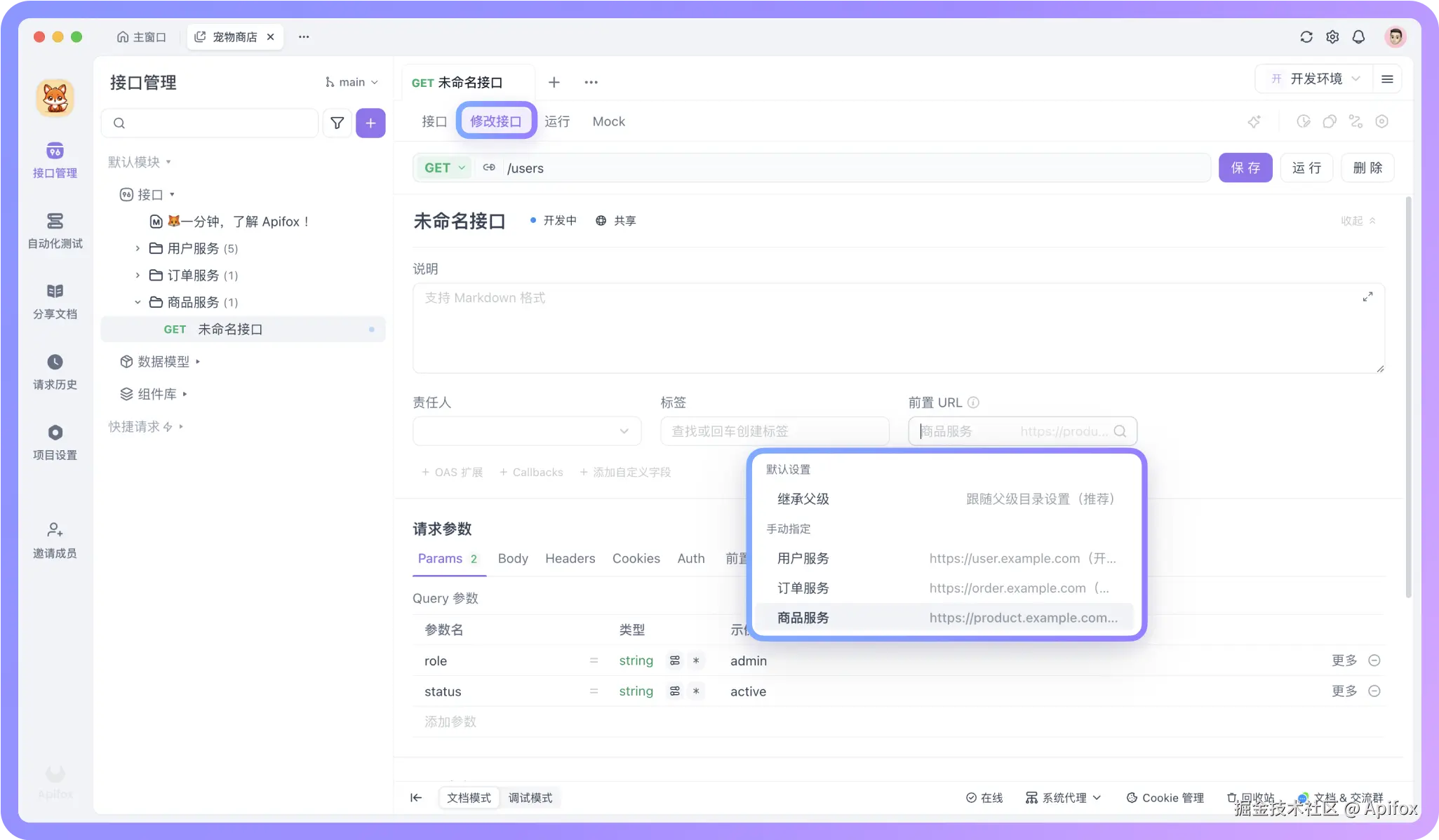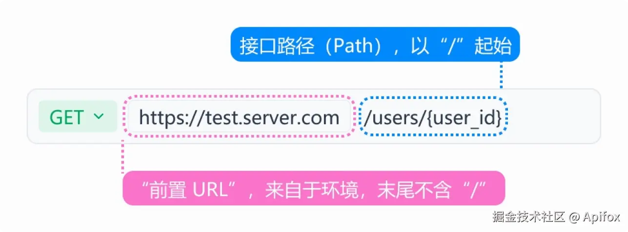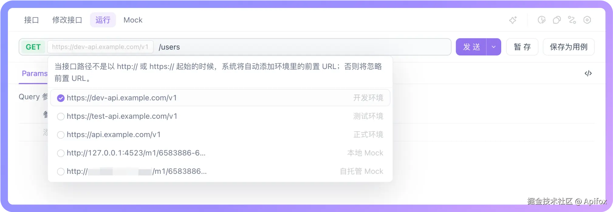 现在当你新建接口时,URL 栏里只需要输入相对路径就可以了。比如你要测试用户列表接口,直接输入 /users,Apifox 会自动拼接成 https://api.example.com/v1/users。