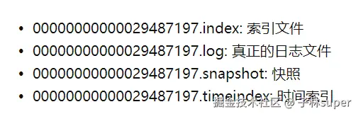 每个分区会映射到broker机器的其中一个目录,在每个日志目录每个日志段(segment)包含四个文件: