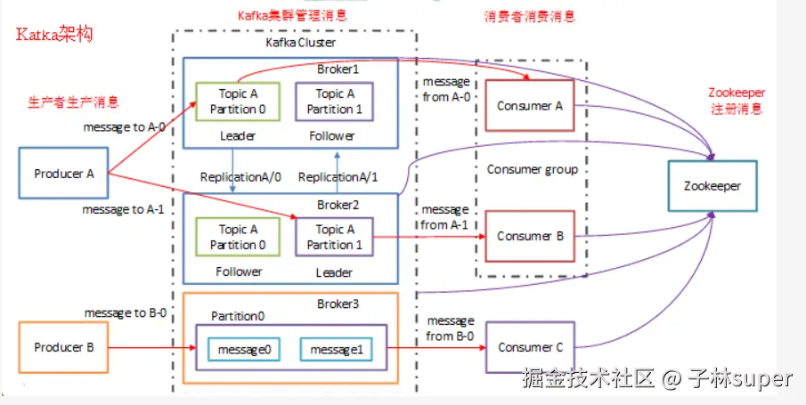 Kafka集群中包含若干Producer(可以是web前端产生的Page View,或者是服务器日志,系统CPU、Memory等),若干broker(Kafka支持水平扩展,一般broker数量越多,集群吞吐率越高),若干Consumer Group,以及一个Zookeeper集群。Kafka通过Zookeeper管理集群配置,选举leader,以及在Consumer Group发生变化时进行rebalance。Producer使用push模式将消息发布到broker,Consumer使用pull模式从broker订阅并消费消息。