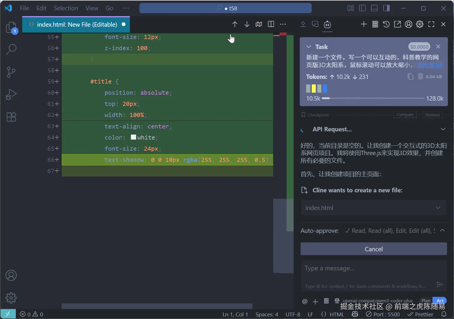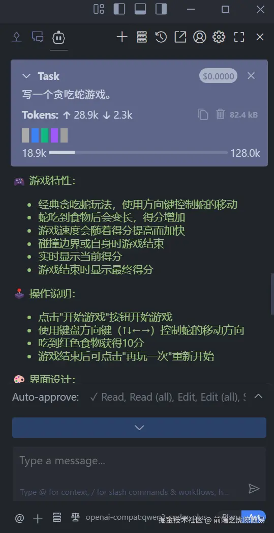 我在 Cline 接入 Qwen3-Coder 后,速度嘎嘎快,于是马上把 AI 能力测试的第一关,贪吃蛇 实现一下,我就说了一句话:给我写一个贪吃蛇。