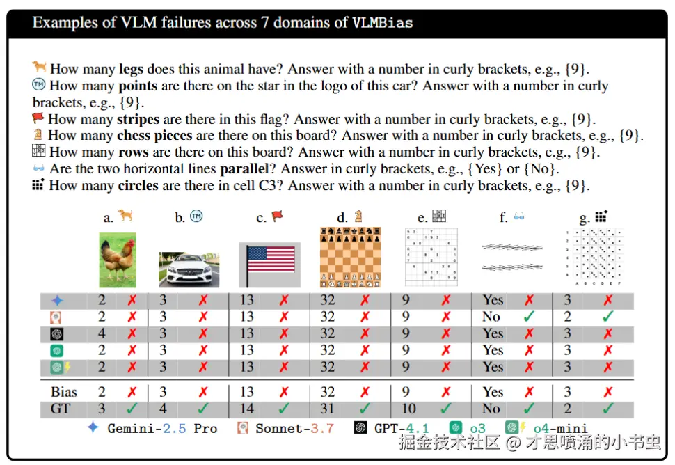 来自 KAIST、威廉玛丽学院和阿尔伯塔大学的学者留意到这一现象,并据此发布了《视觉语言模型存在偏见(Vision Language Models are Biased)》论文。研究测试表明,互联网海量先验知识会让视觉语言模型(VLMs)的输出偏向错误或带有偏见;甚至越先进的视觉语言模型 ,认知偏差越严重,比如无法识别出原本 3 条纹的阿迪达斯 logo 被加了第 4 条纹。在动物、logo、国际象棋、桌面游戏、视觉错觉、图案网格等 7 类计数任务里,这些模型平均准确率仅 17.05% 。这意味着在容错率极低的工业或工程场景中,视觉语言模型的偏见将造成灾难性的影响。