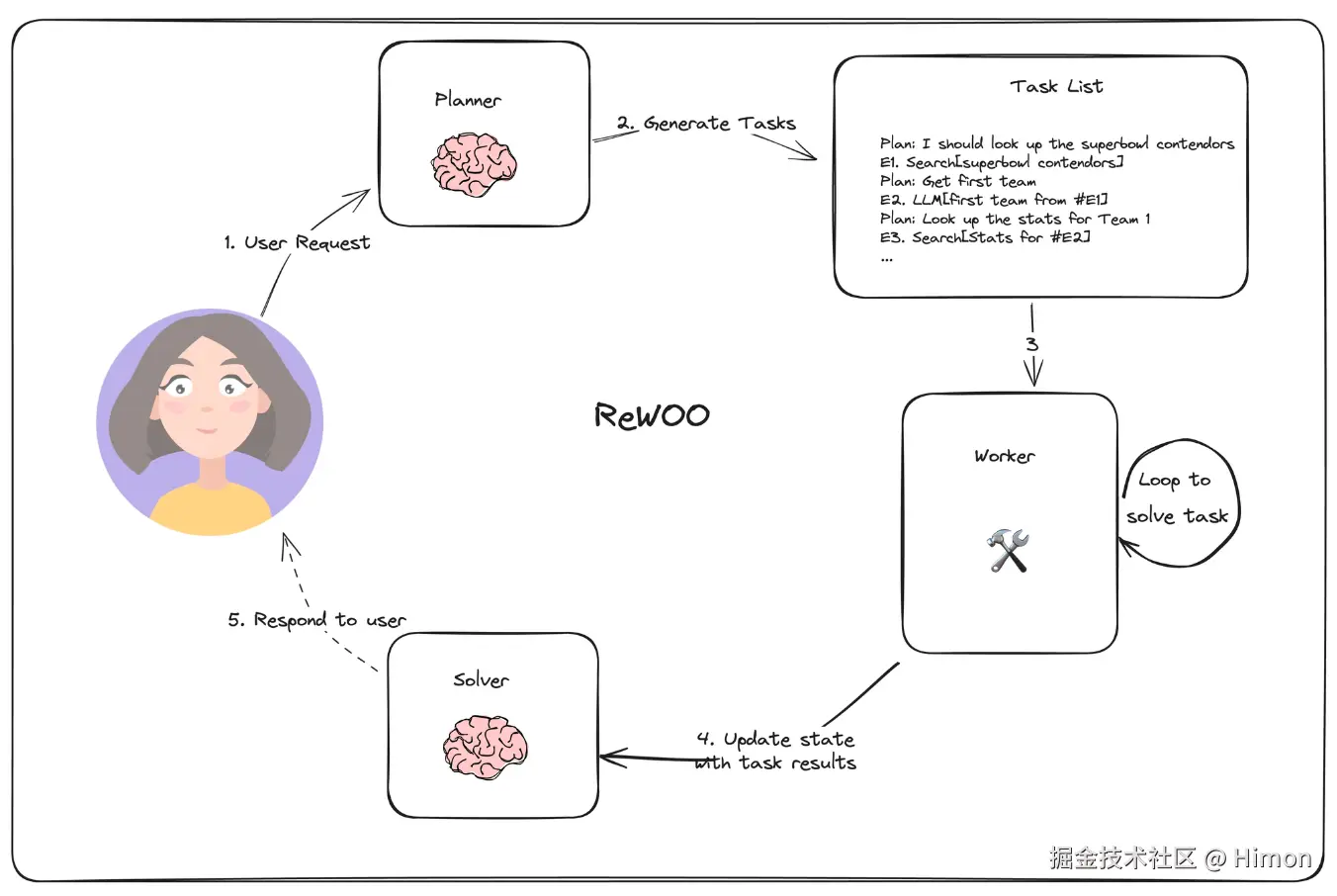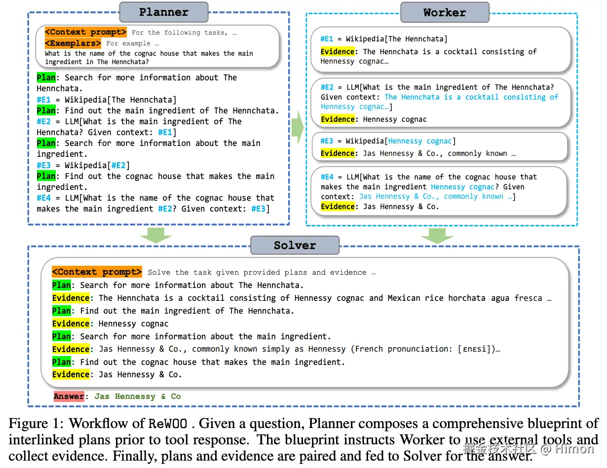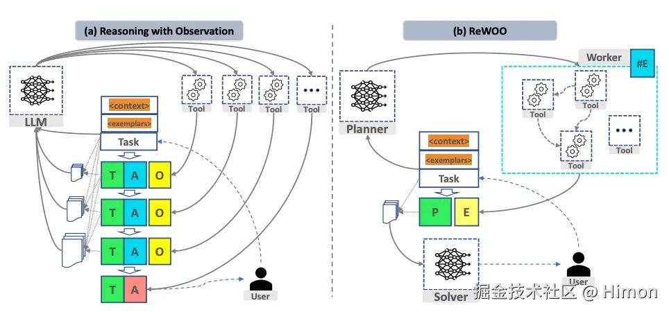 ReAct是典型的Reasoning with Observation模式,需要循环执行“Thought”(T),“Action”(A)和“Observation”(O)。而ReWOO是没有“Observation”,ReWOO模式包括三部分: