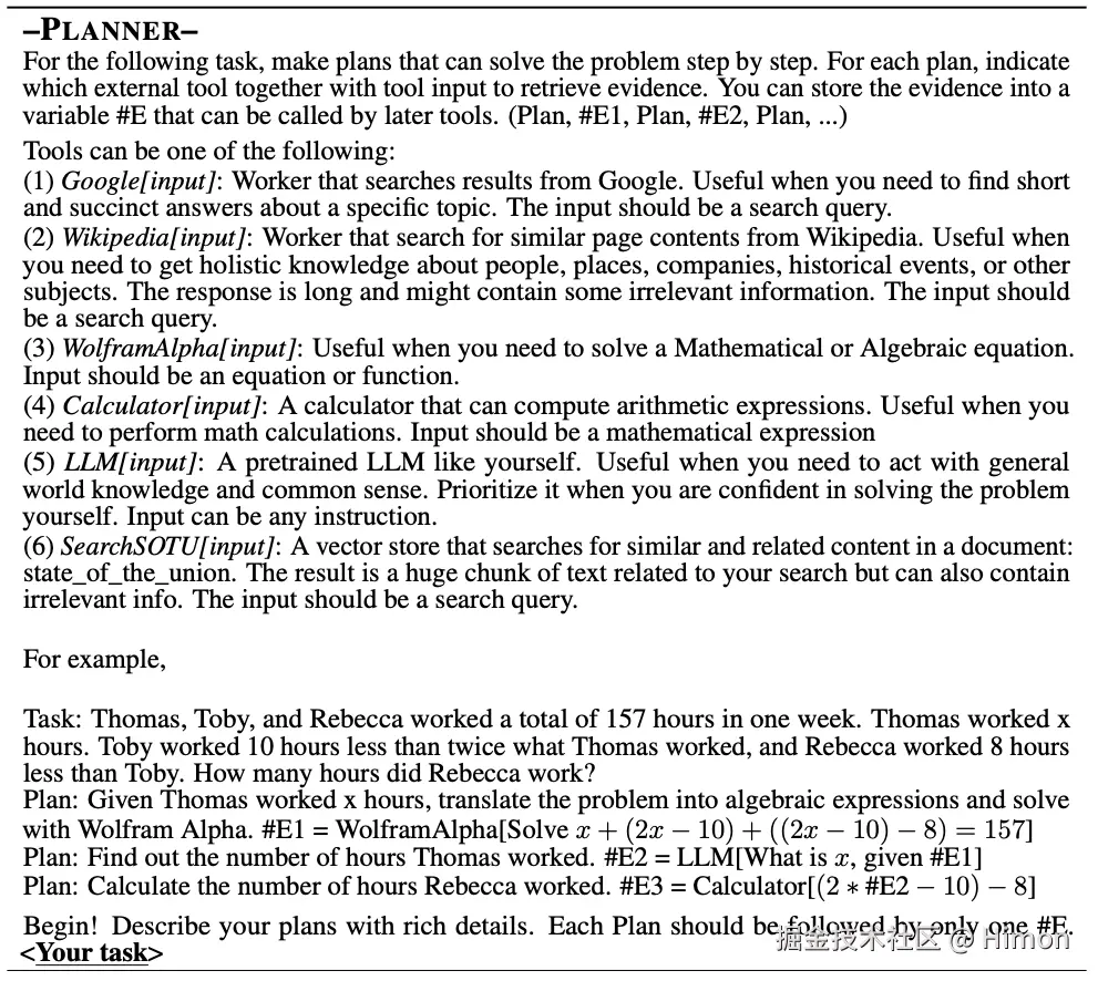 - Planner:充分利用LLM的推理和规划能力生成“问题解决蓝图”,生成任务执行列表,每一步任务用(Plan,#E)来描述,其中“Plan”是文字描述当前的执行步骤,是用约定的格式来表示需要执行的tool,下标s表示执行的第几步。这种模式,让ReWOO能够解决多步和更复杂的问题,尤其是子任务需要依赖前面某个任务结果(observation)的情况,只需要将依赖步骤的observation通过prompt拼接起来送给Worker即可,可以看下面的例子。