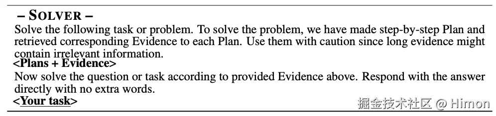 - Solver:通过prompt汇总所有的plan和evidence来模拟解决原始的问题,这里我们在prompt中让LLM尽可能谨慎可以提高最终的表现。