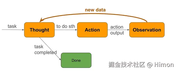 LLM根据当前的结果(Observation),推理和思考(Thought),决定执行什么行动(Action),通过function call的机制得到最新的结果(Observation),然后再使用LLM推理和思考,循环执行,直到LLM自己判断完成任务,则结束。