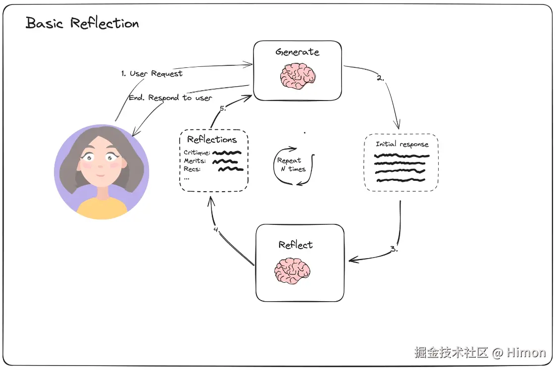 反思模式,通过prompt让agent观察过去执行步骤的结果(observation)来评估选择执行动作的质量,生成评估结果和改进建议,用经验来重构prompt,循环执行持续优化结果,需要设定一个最大循环次数或者通过LLM来判断生成的结果是否正确,作为结束条件。