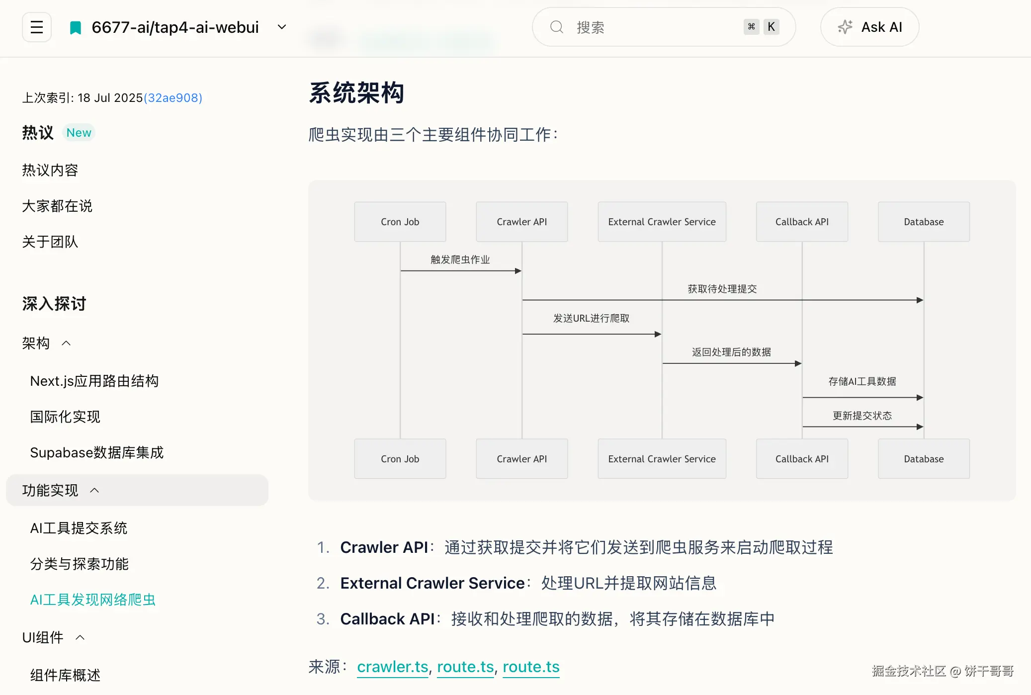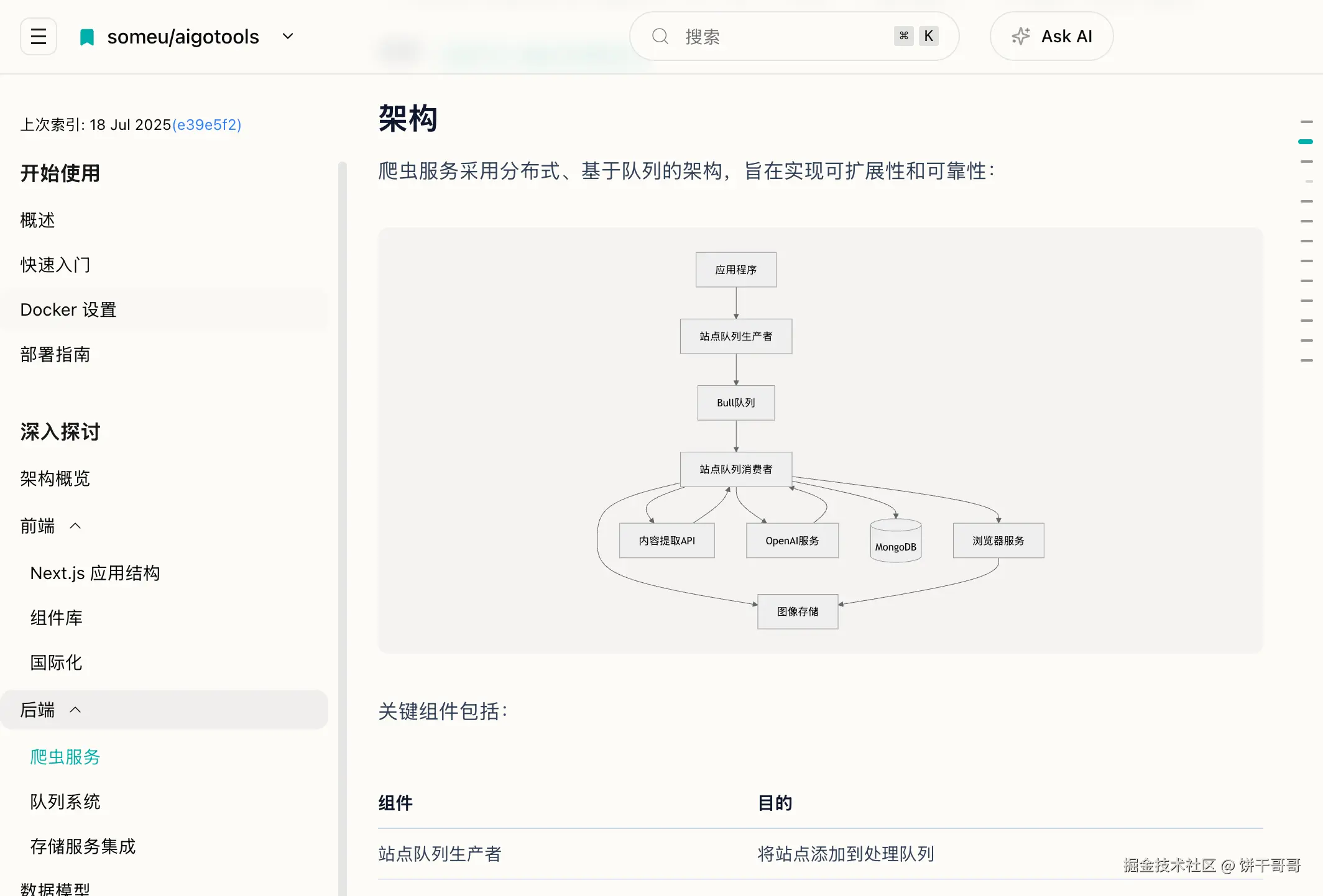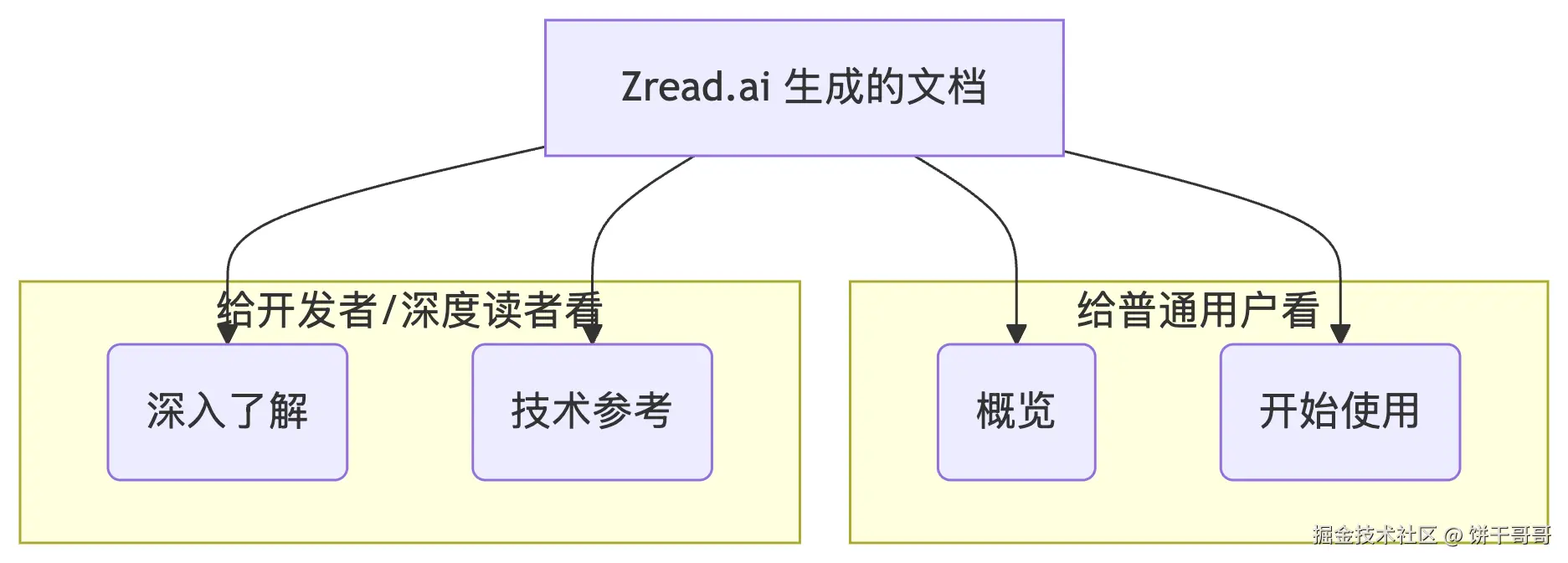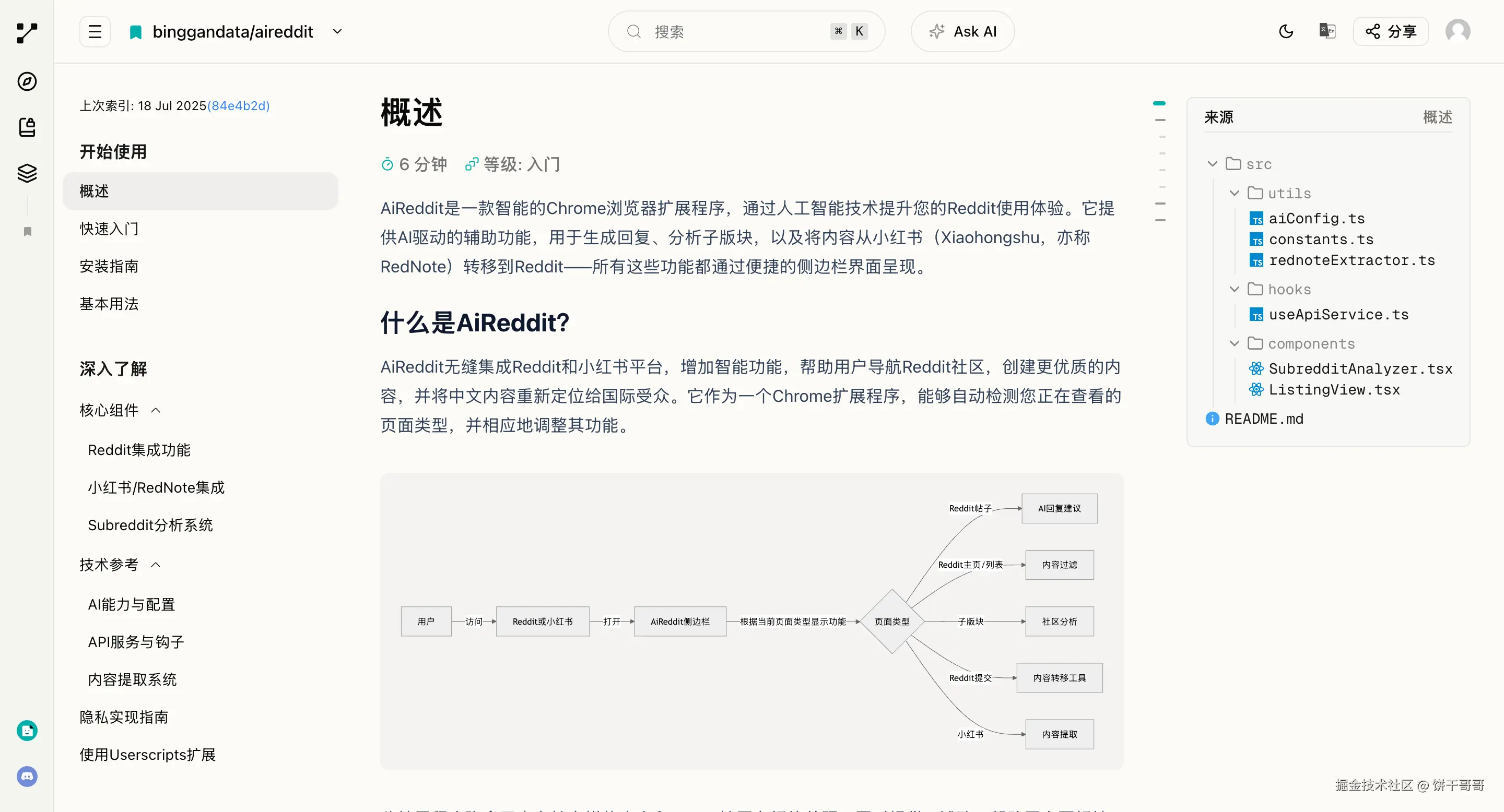 Zread.ai生成的**「概述」和「开始使用」部分就完美解决了这个问题。它不仅总结了** AiReddit 的核心功能,还非常智能地生成了产品架构图,把复杂的功能逻辑可视化了。