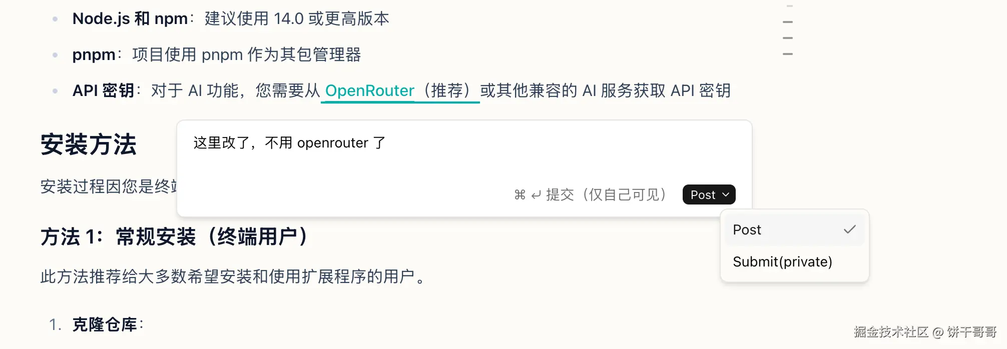 比如,我自己的项目中的 AI 模块最早是用 OpenRouter 但其实现在不用了,但代码没改好,导致项目文档还是它。我就在旁边加一条私有笔记。