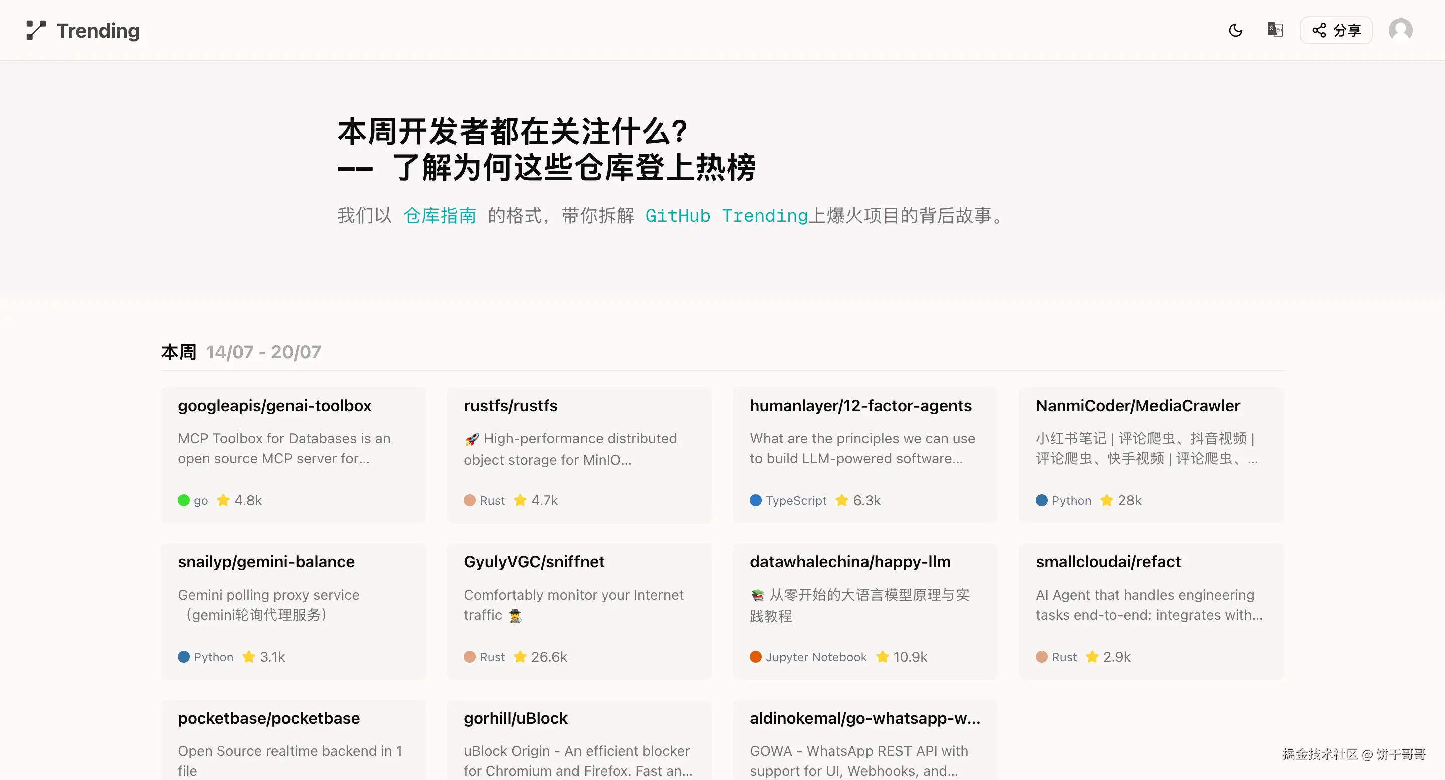 除了深度分析自己的项目,Zread还集成了GitHub Trending功能。它会用同样的方式,定期分析GitHub上的热门项目,并生成解读指南。