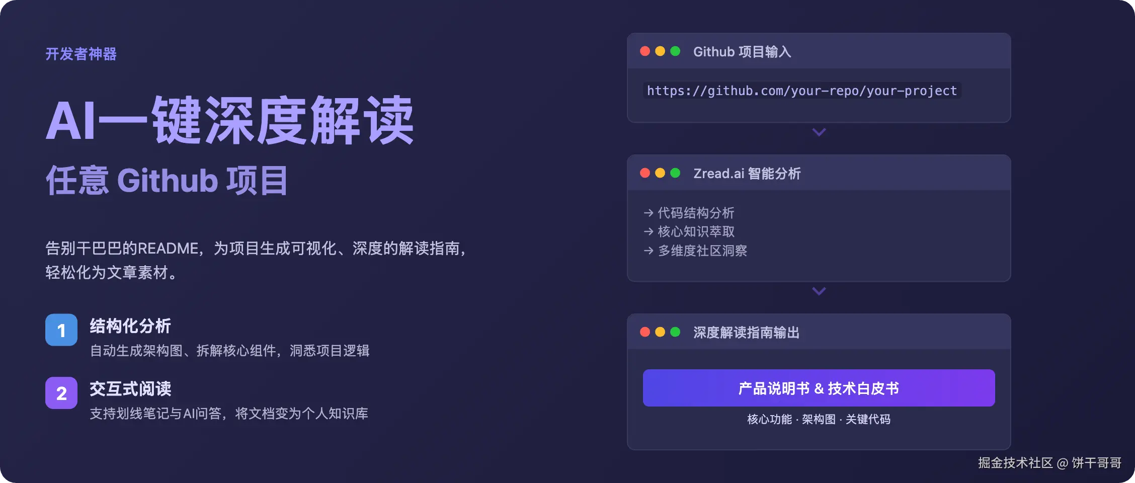 正当我抓耳挠腮,准备硬着头皮花一两天时间手写时,在外网小黑书刷到了一个新工具 Zread.ai,号称能一键把GitHub项目“翻译”成清晰易懂的深度解读文档。
