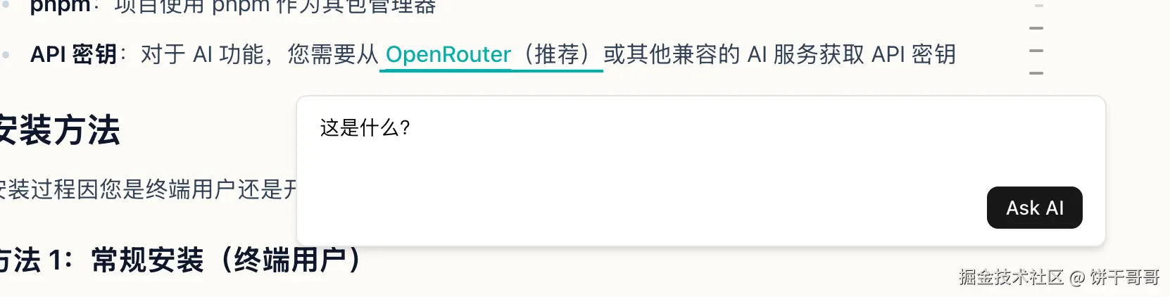 比如,看到“pnpm:项目使用pnpm作为其包管理器”,如果你不清楚pnpm是什么,直接选中“pnpm”并提问“这是什么?”,AI就会告诉你它的作用和优势,而不需要你跳出页面去搜索或问其他 AI,学习流程被打断。