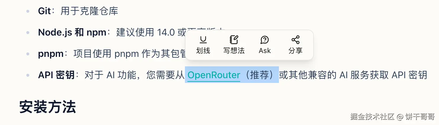 比如,在看项目的「安装方法」时,读到感兴趣的地方,就可以直接选中这段文字,弹出的工具栏能让你快速高亮关键信息。