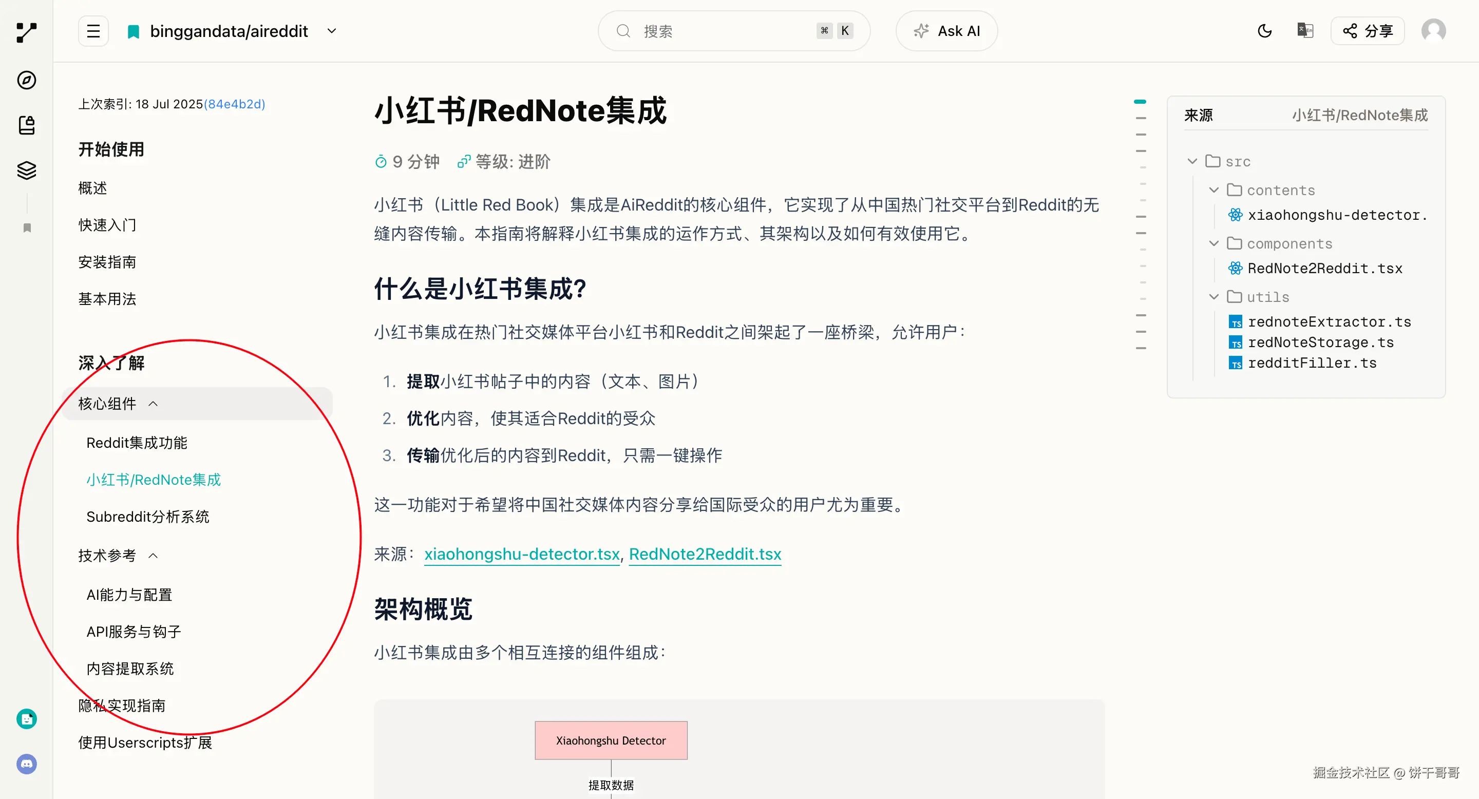 比如,我的AiReddit插件里有一个核心功能是“小红书/RedNote集成”,它不仅解释了这是干嘛的,还把相关的架构图、数据结构、代码片段都给你扒得明明白白,甚至连代码来源的文件路径和行数都给你标出来了!