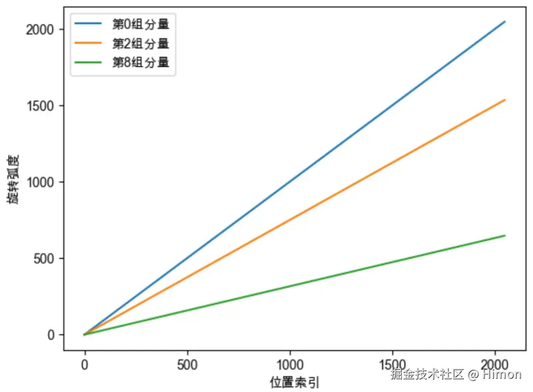 - 图二,展示了第0组分量旋转弧度的变化,位置插值法将0位置的旋转弧度变成原来的一半, 就可以看到[2048,4096]的旋转弧度了。