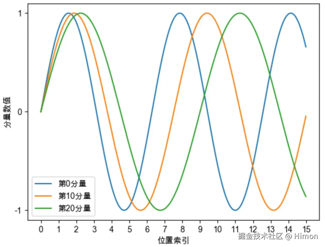 正弦曲线位置编码每个分量都是正弦或者余弦函数,具有周期性。如下图,每个分量都有周期性,而且越靠后的分量,波长越大,频率越低。