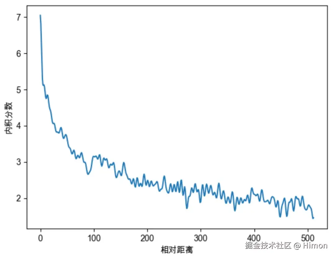 正弦曲线位置编码还具有远程衰减的性质:对两个相同的词向量,如果他们之间的距离越近,相对位置就越小,则他们的内积分数就越高,反之越小。
